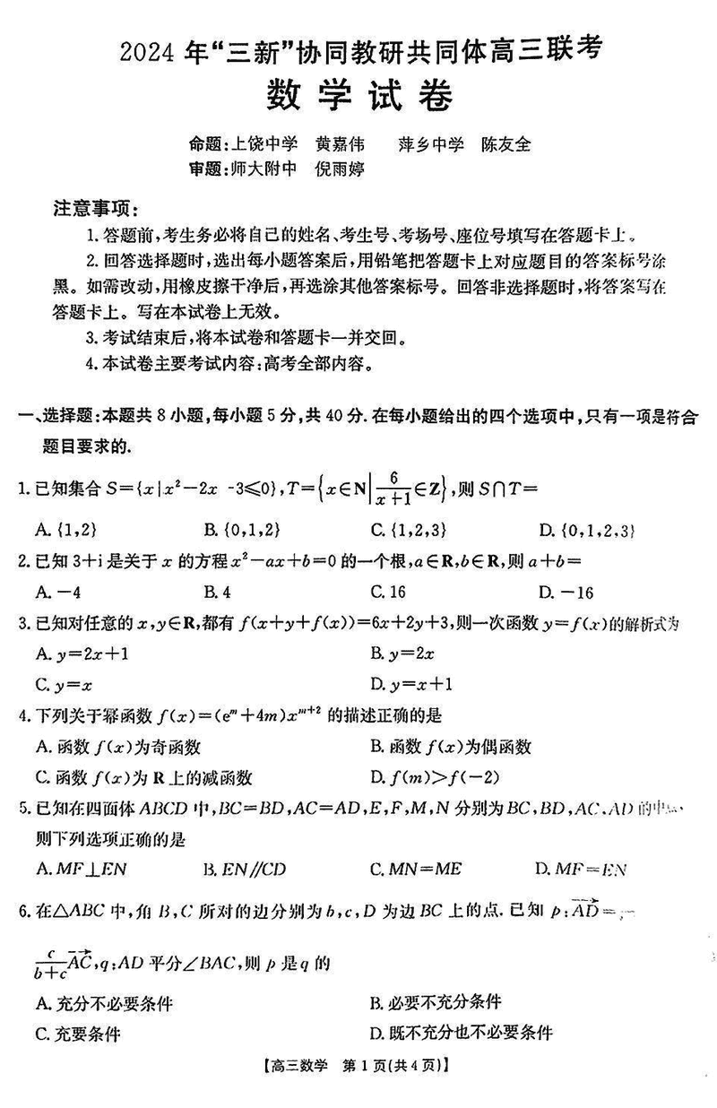 2024年江西三新协同教研共同体高三12月联考数学试题及答案