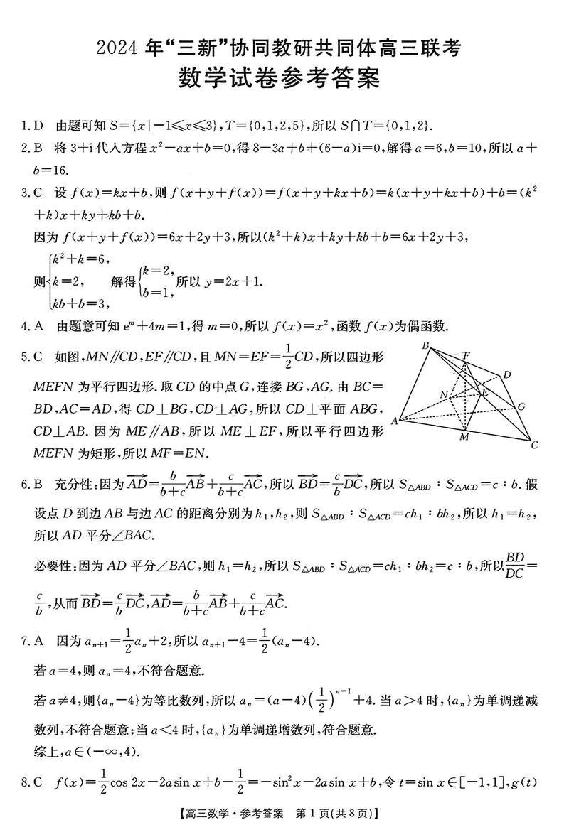 2024年江西三新协同教研共同体高三12月联考数学考试已于近日开考,为方便考生考后及时查看考试情况,查漏补缺、弥补不足,本文整理了试题答案解析相关信息!