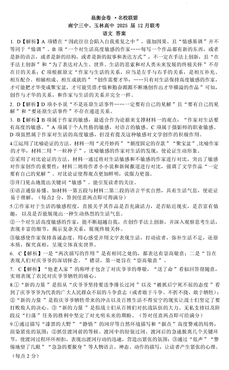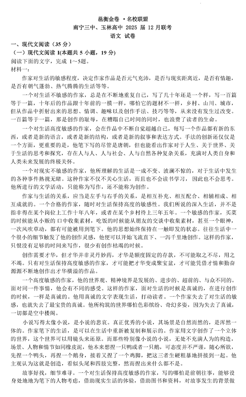 广西邕衡教育名校联盟2025届高三年级12月联考语文考试已于近日开考,为方便考生考后及时查看考试情况,查漏补缺、弥补不足,本文整理了试题答案解析相关信息!