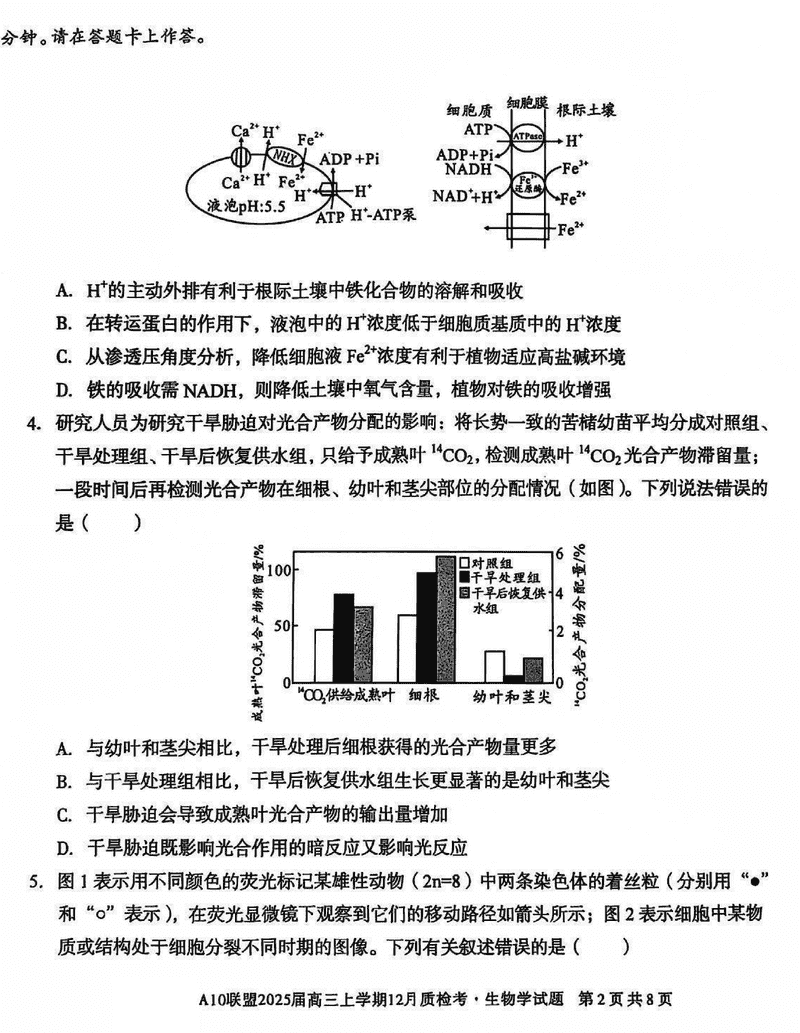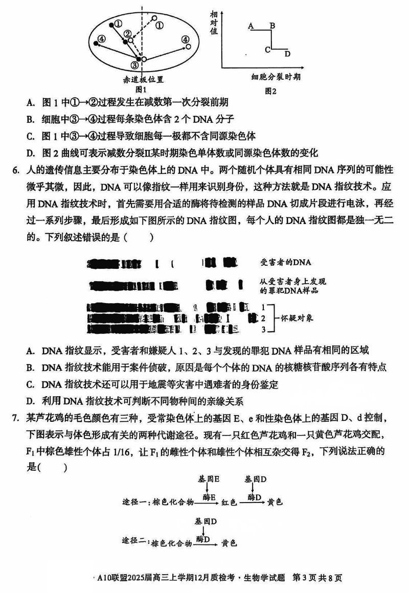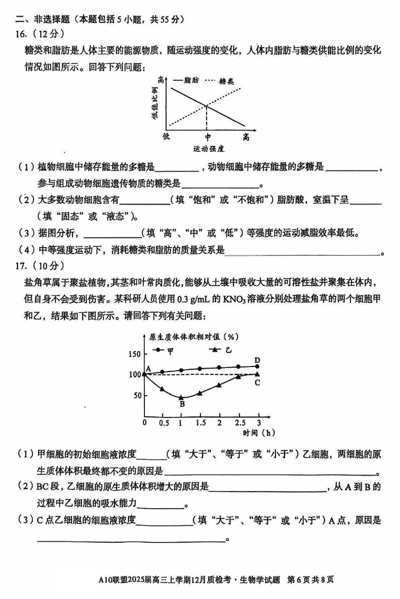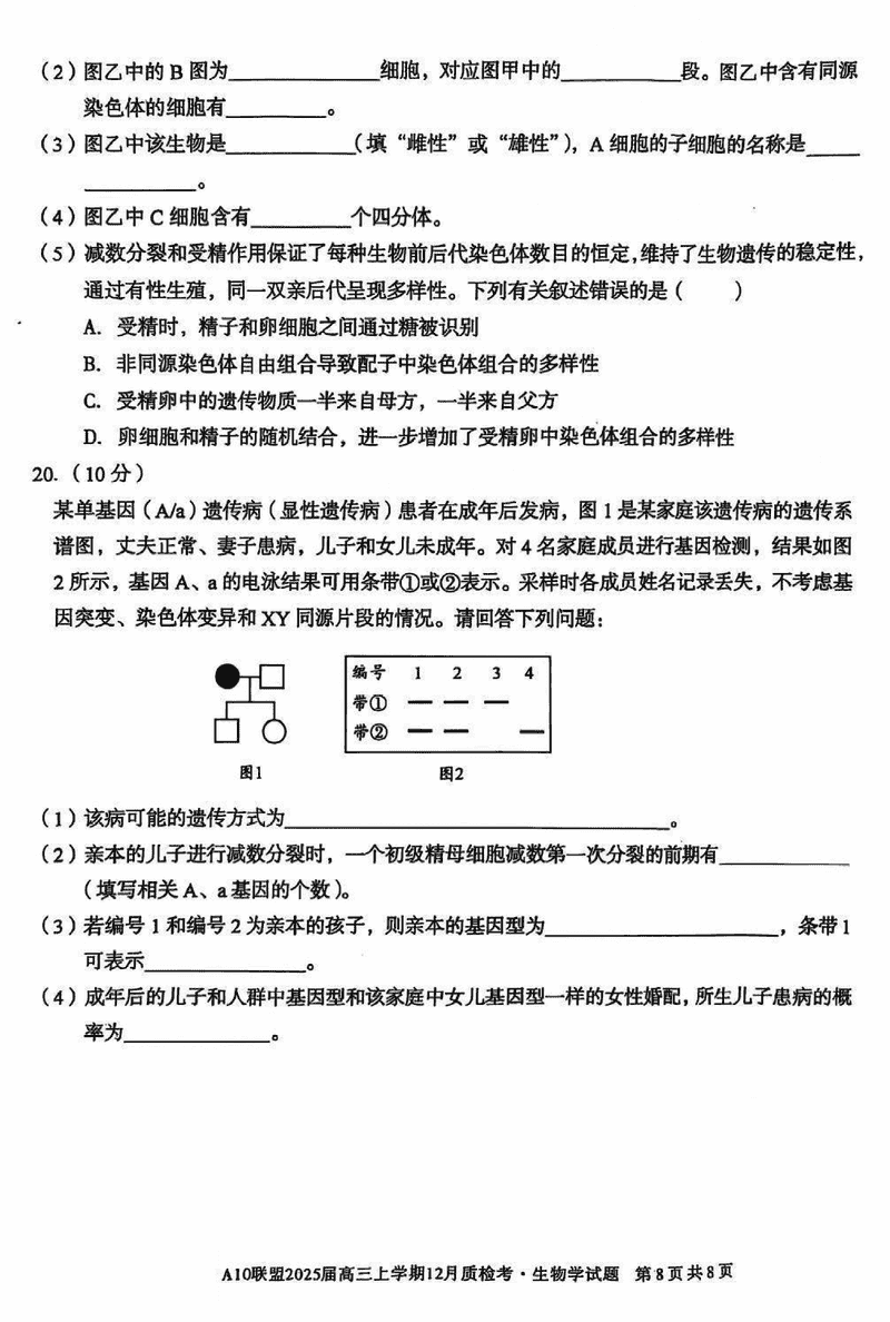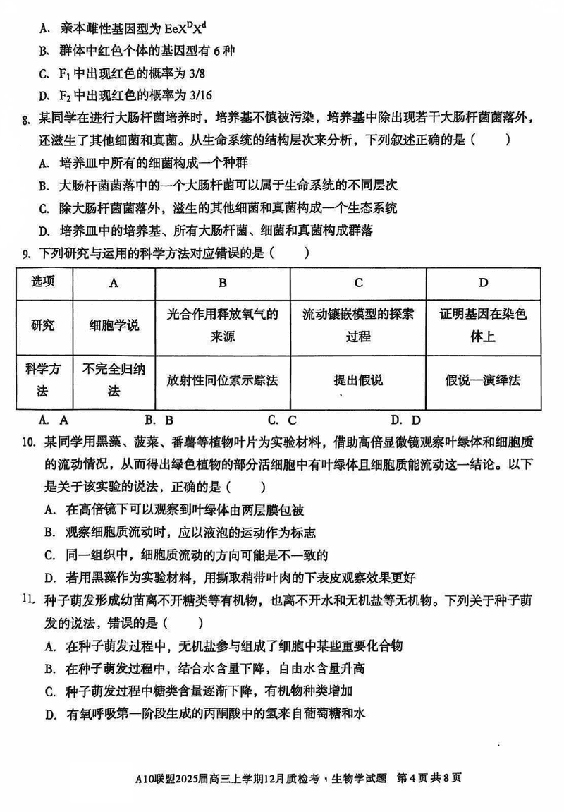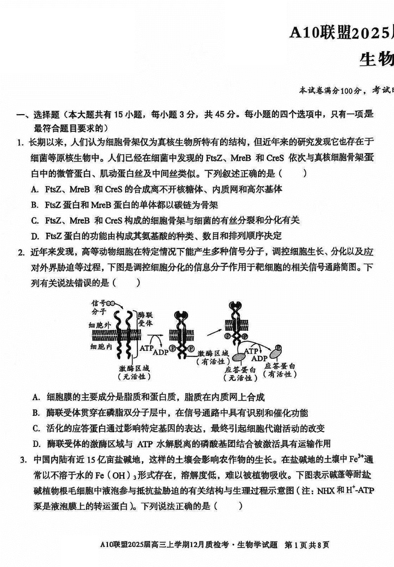 安徽省1号卷A10联盟2025届高三上学期12月质检生物试题及答案