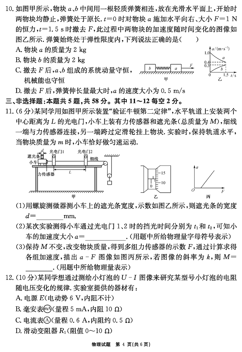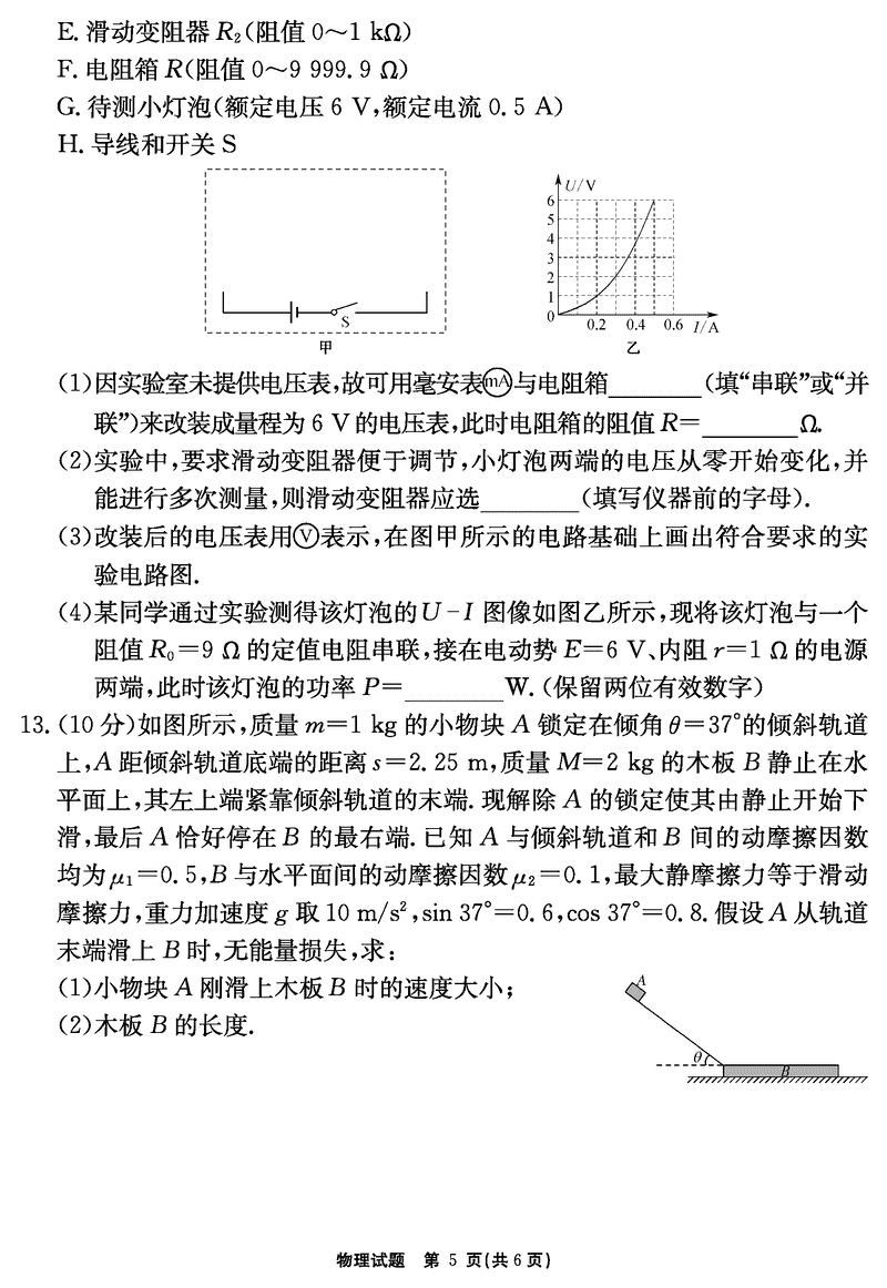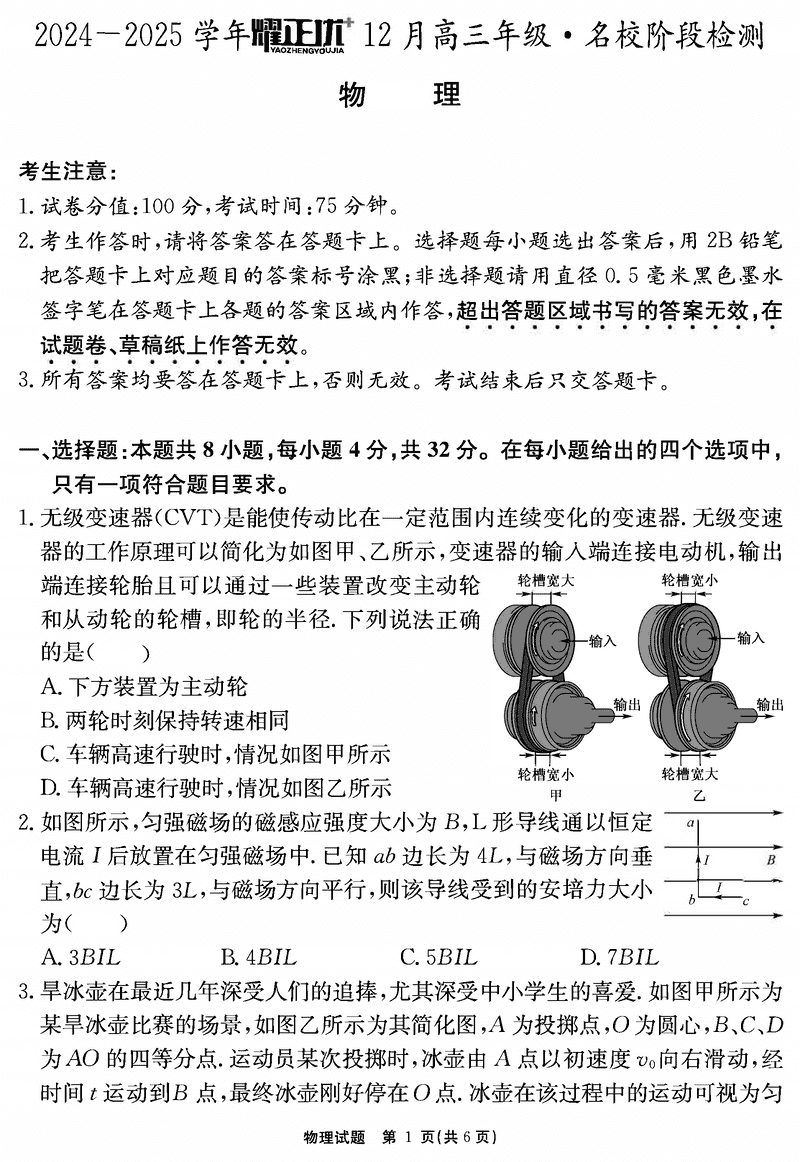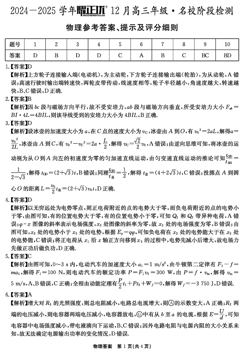 安徽2024-2025学年耀正优12月高三名校阶段检测物理试题及答案