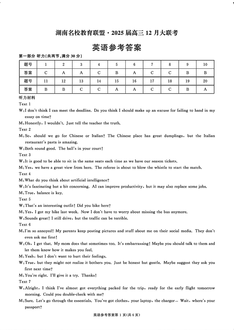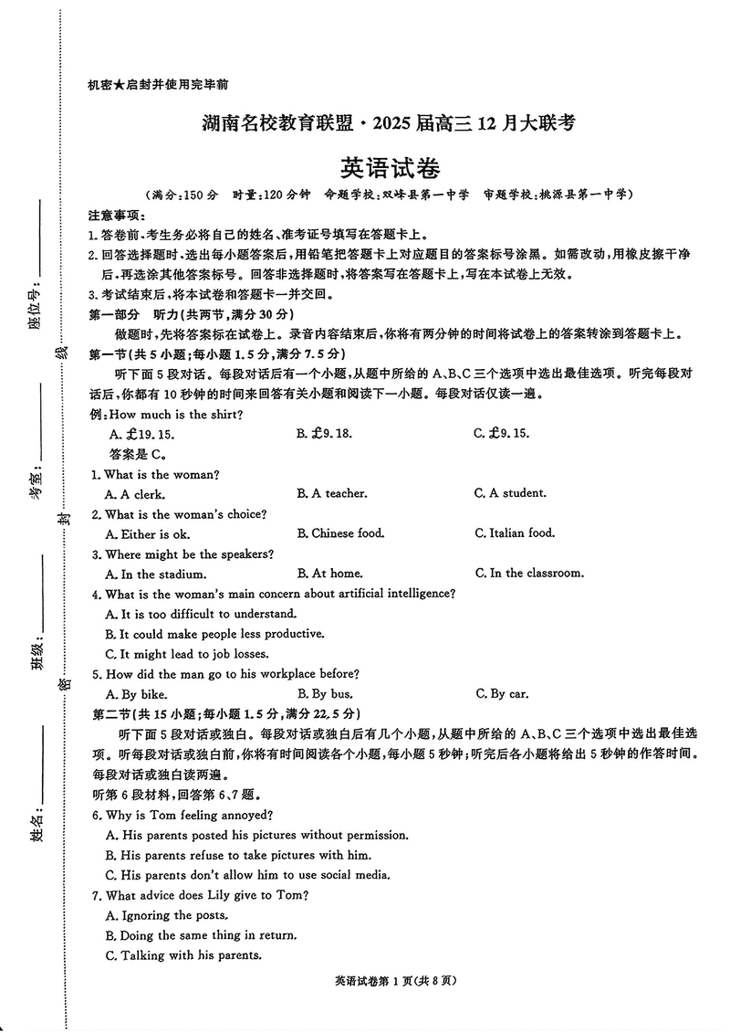湖南省名校教育联盟·2025届高三12月大联考英语试题及答案