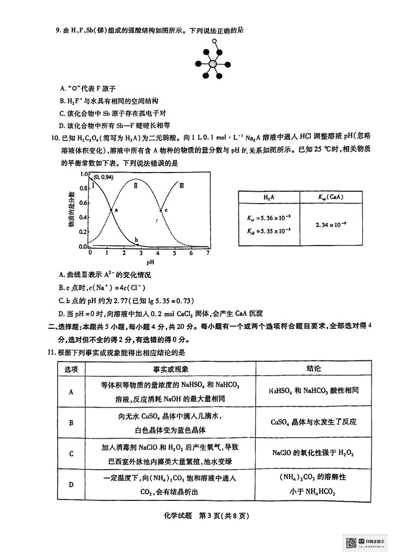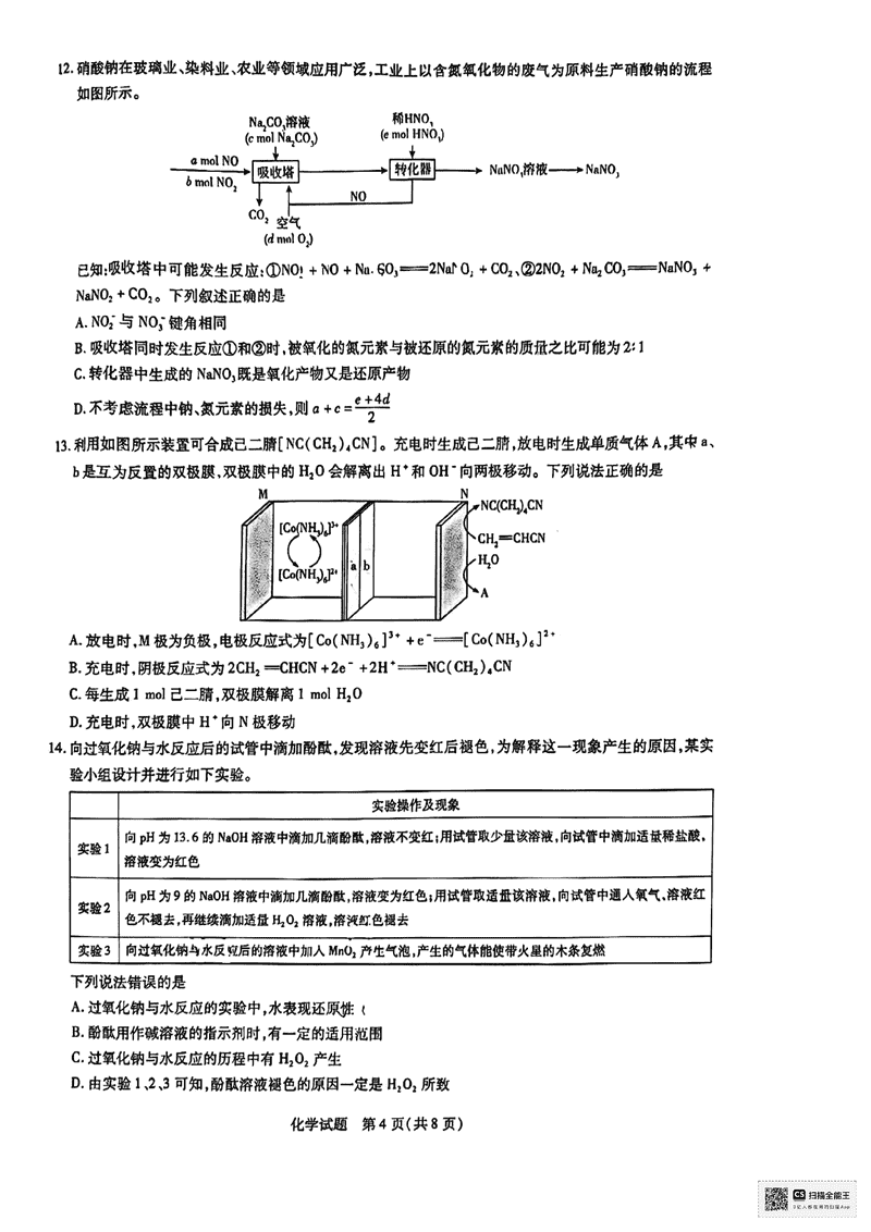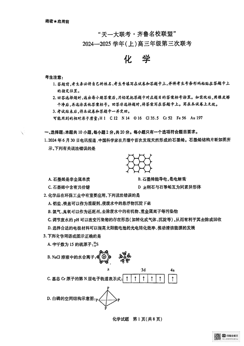 山东齐鲁名校联盟天一大联考2024年12月高三第三次联考化学试题及答案