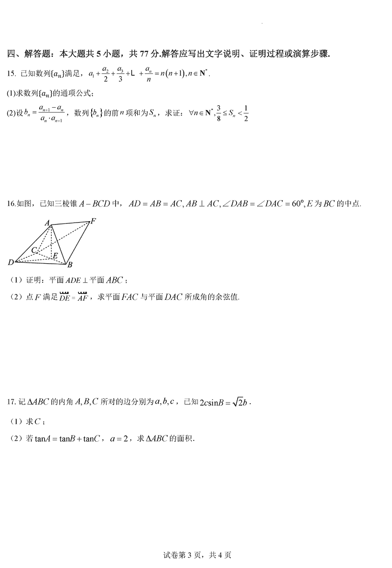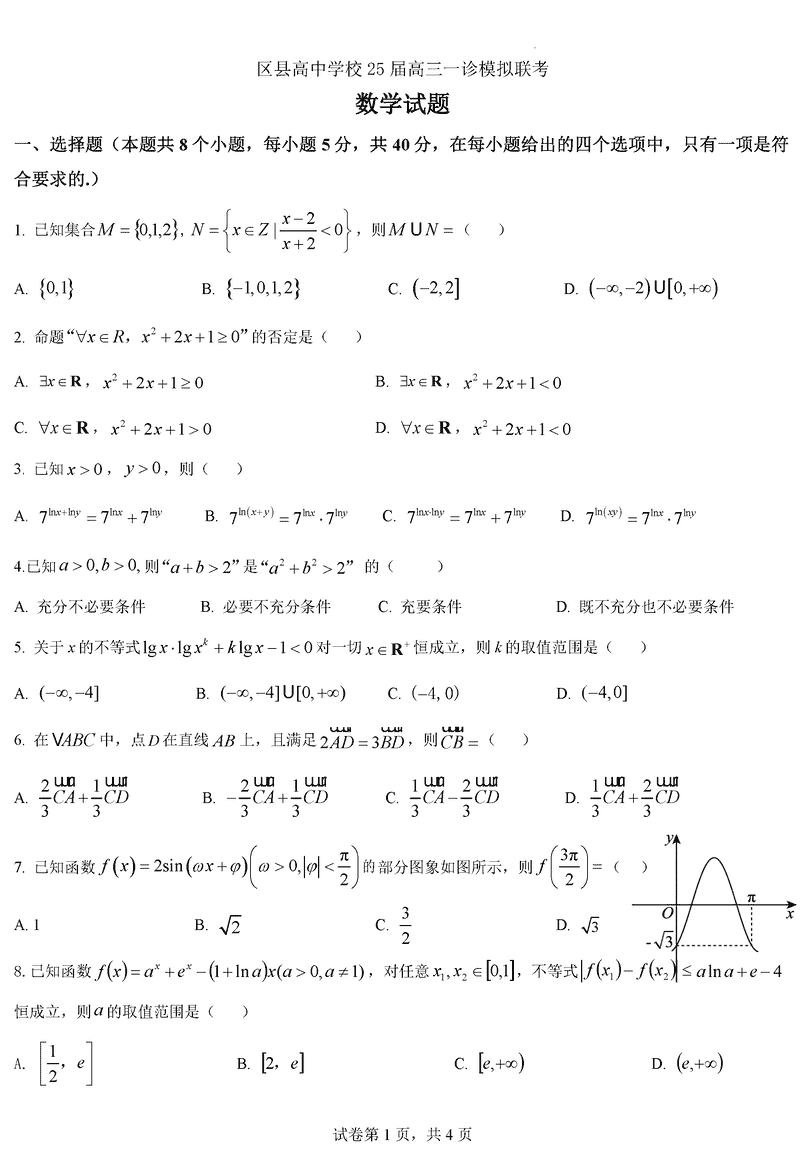 眉山市区县高中2025届高三上学期一诊模拟联考数学试题及答案
