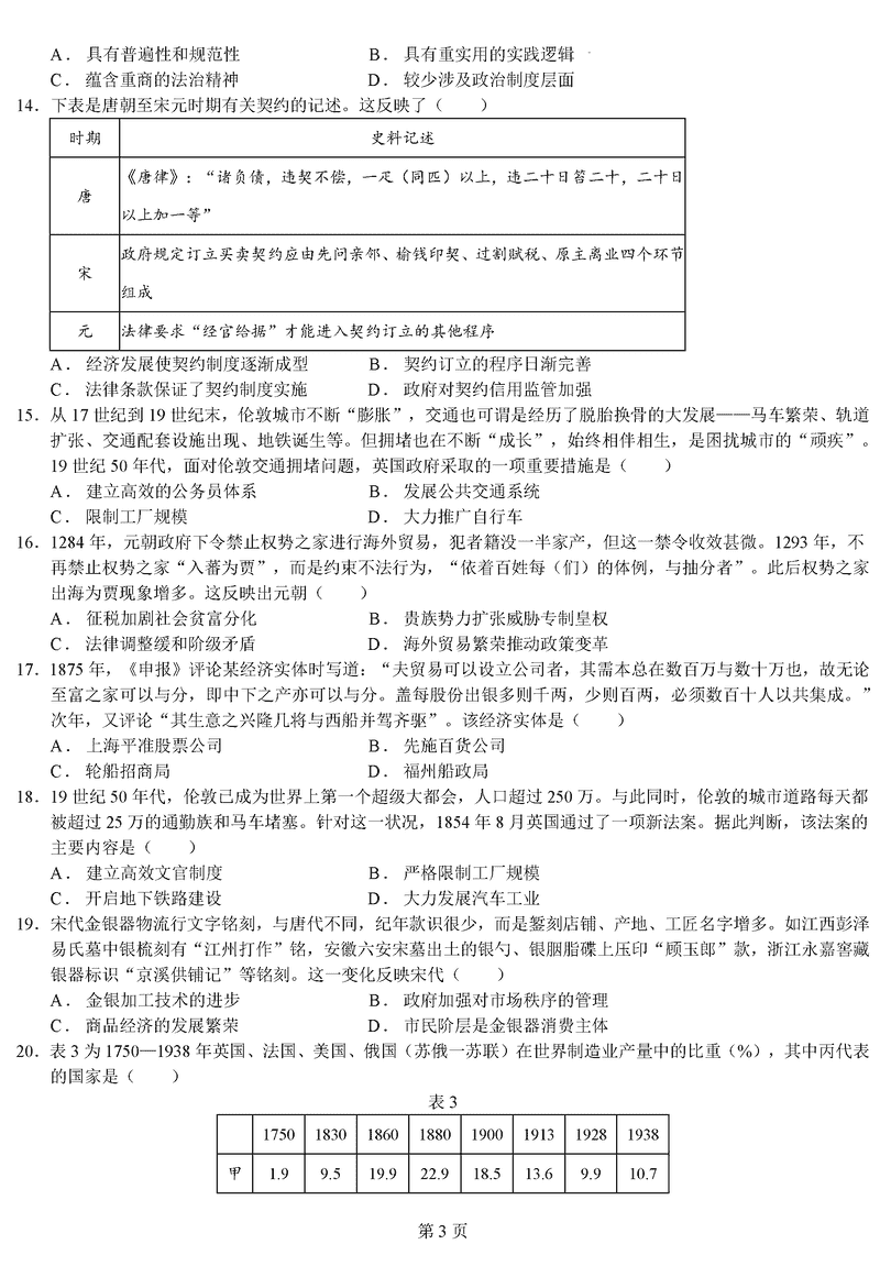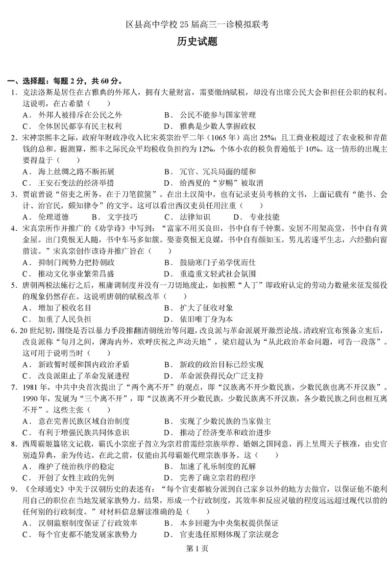 眉山市区县高中2025届高三上学期一诊模拟联考历史试题及答案
