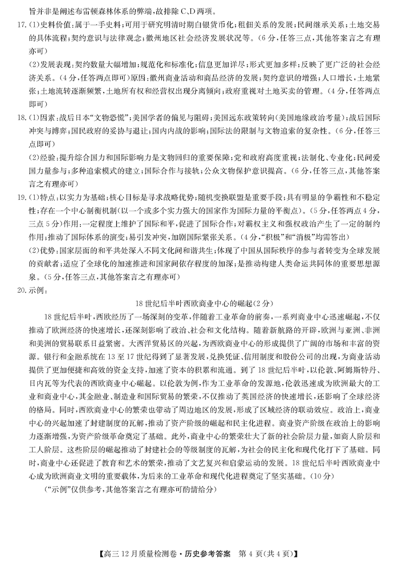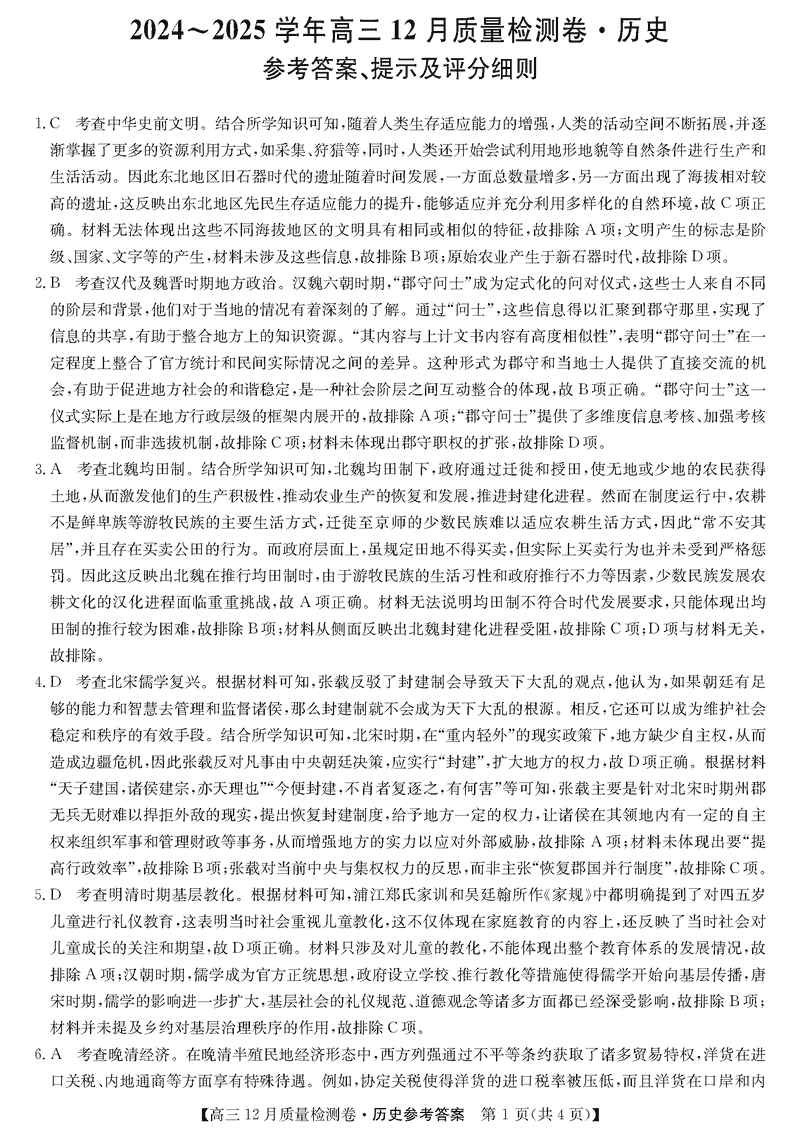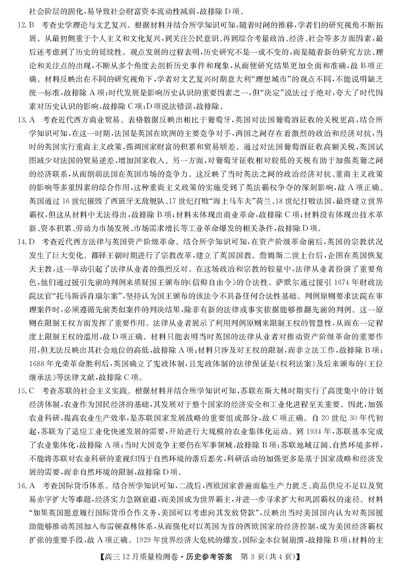 山西三晋卓越联盟2024年12月高三质检历史试题及答案