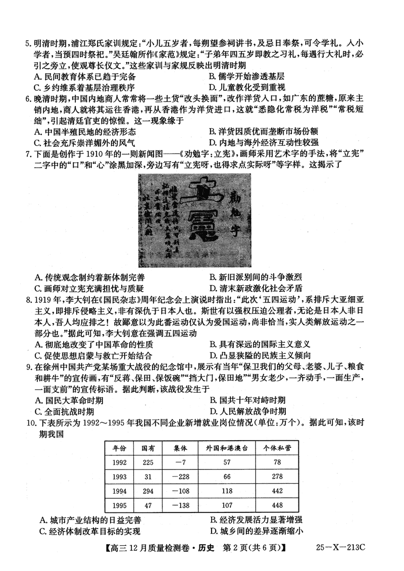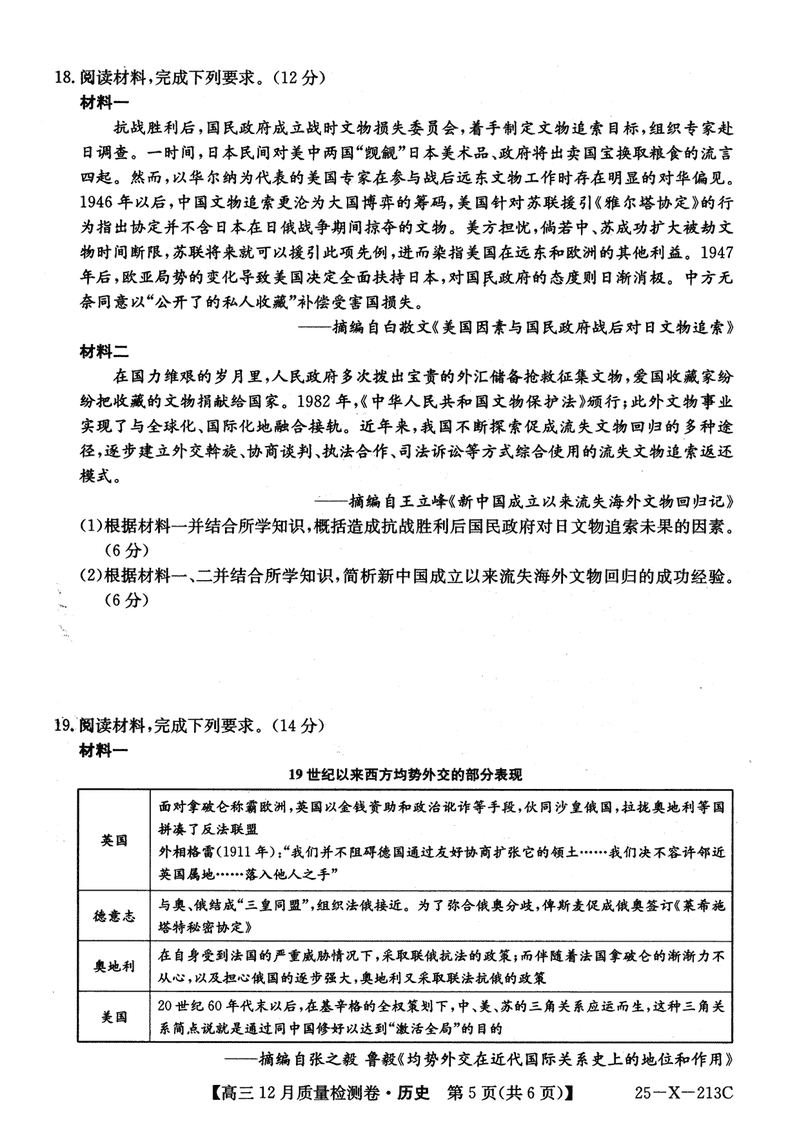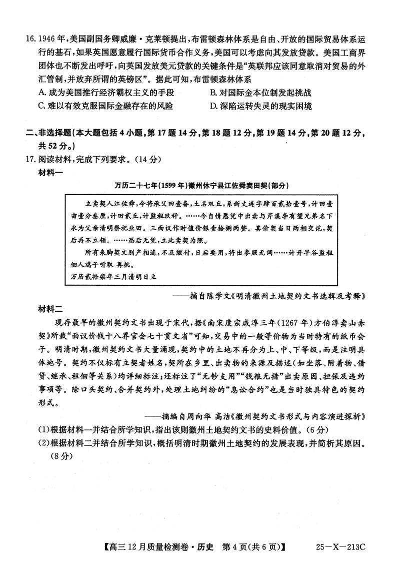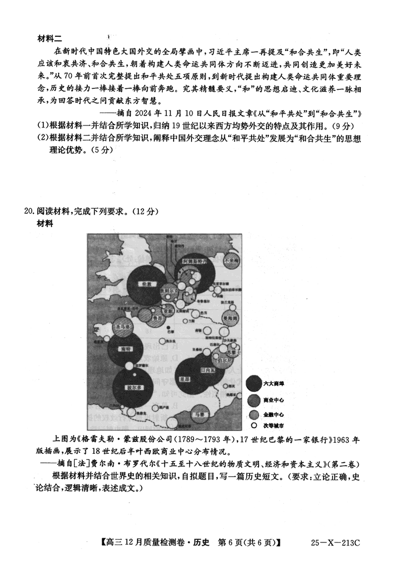山西三晋卓越联盟2024年12月高三质检历史试题及答案