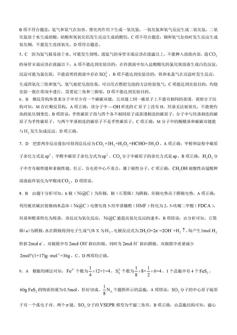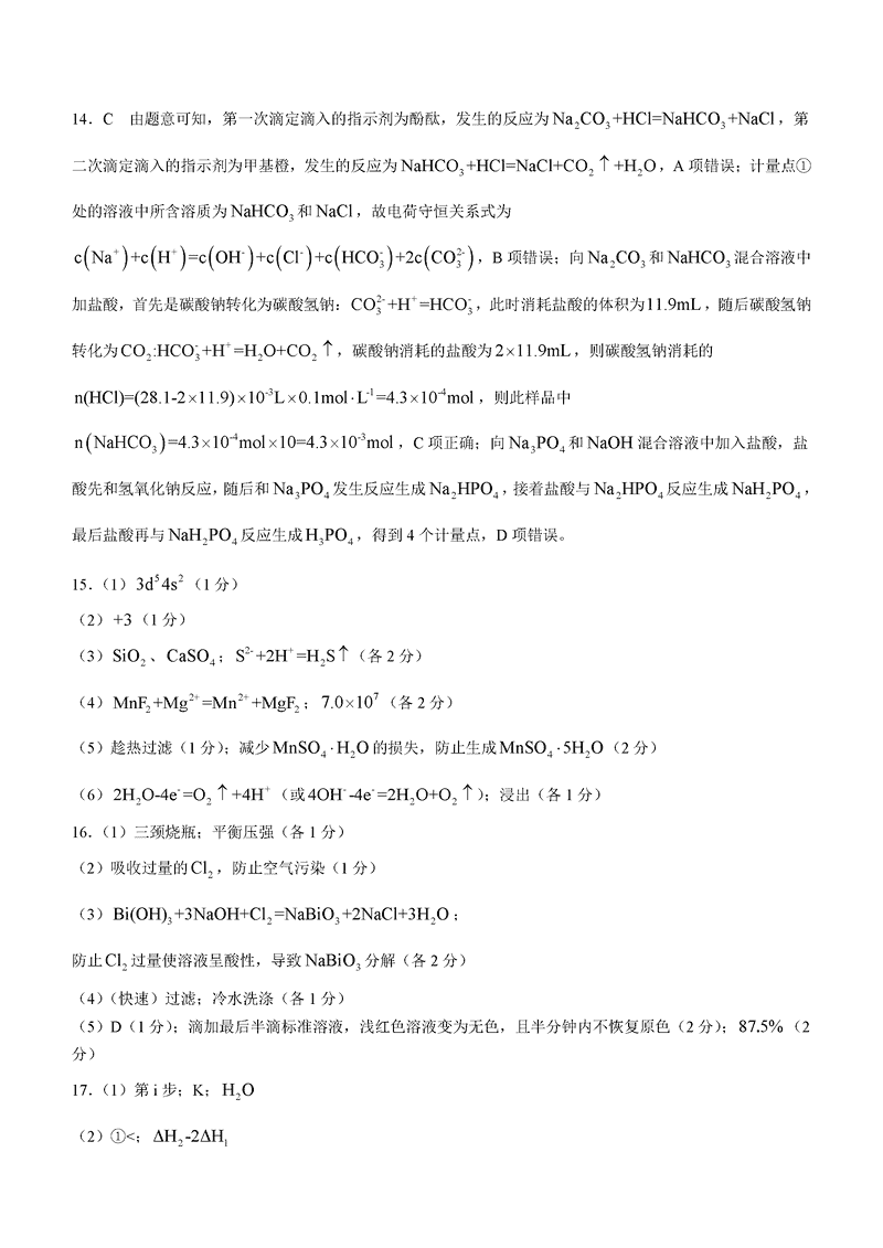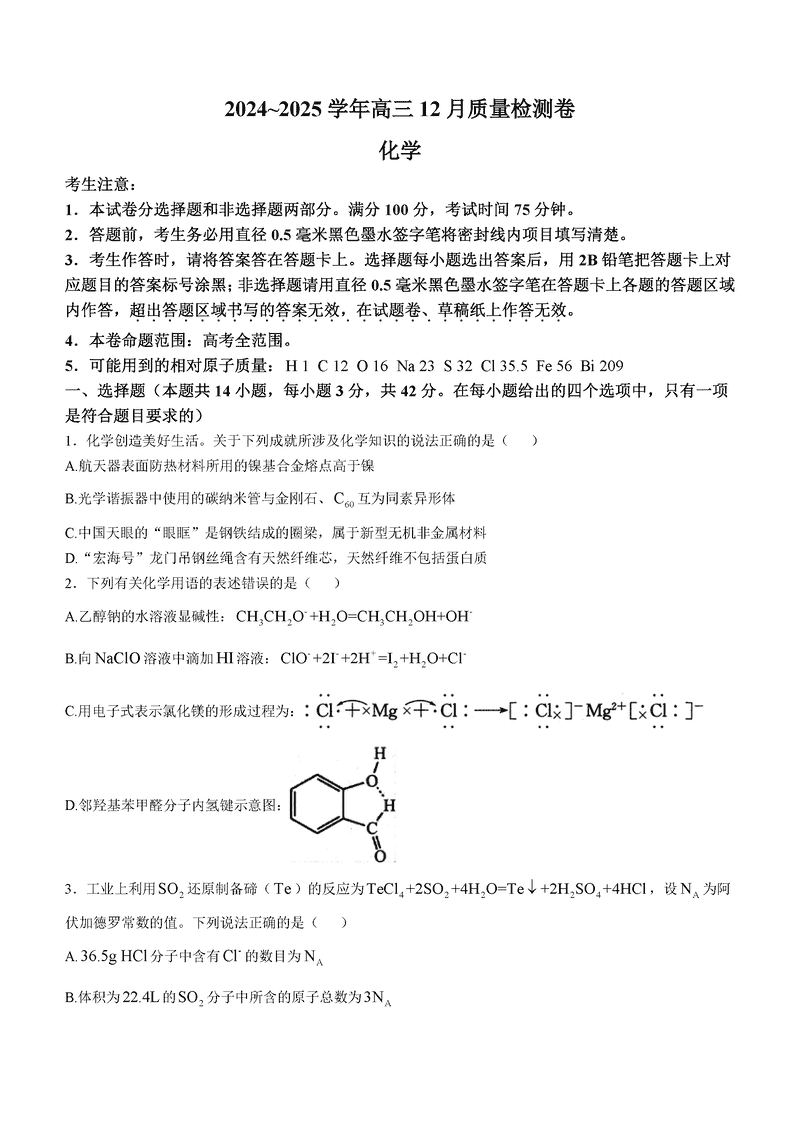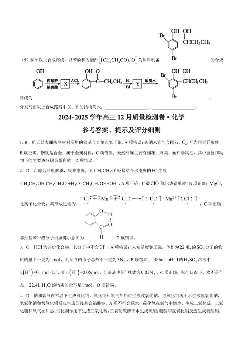 山西三晋卓越联盟2024年12月高三质检化学试题及答案