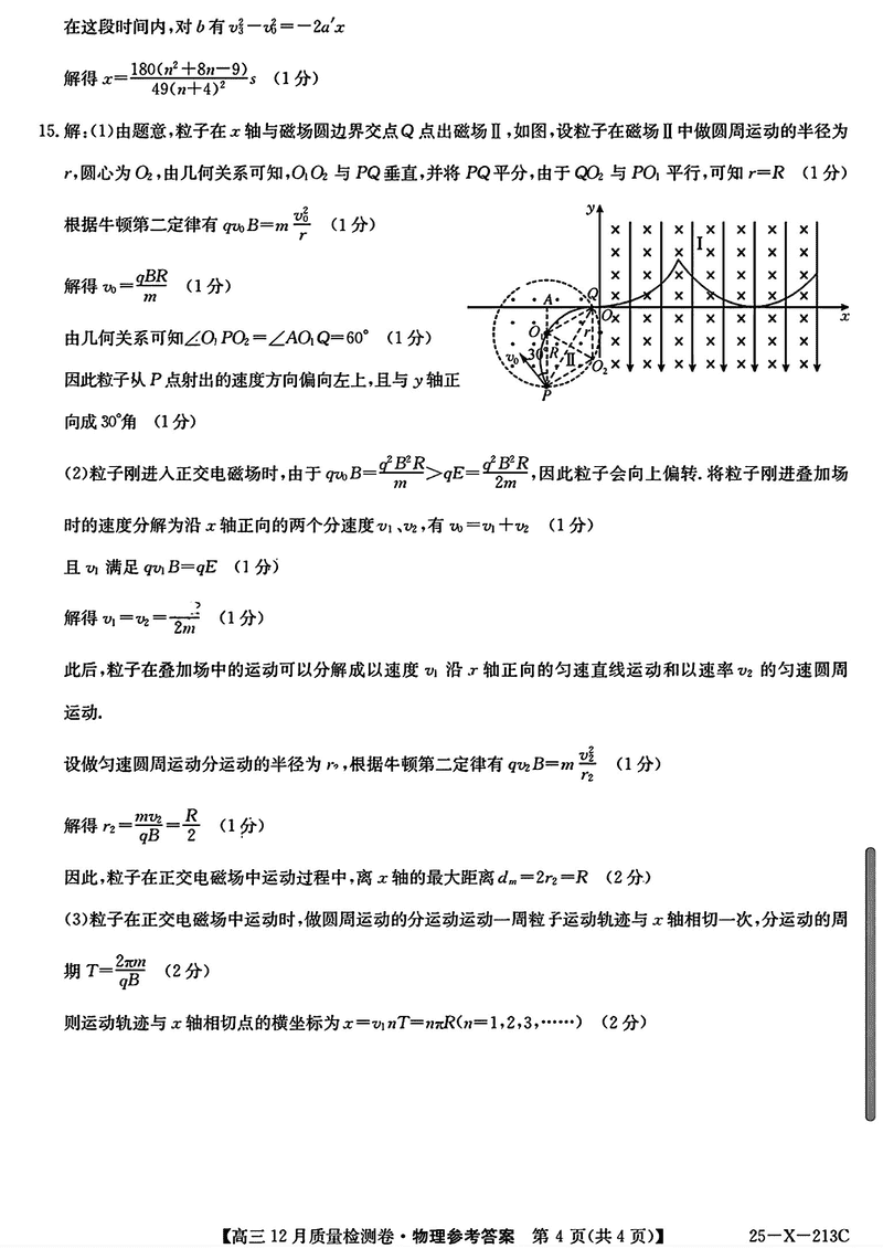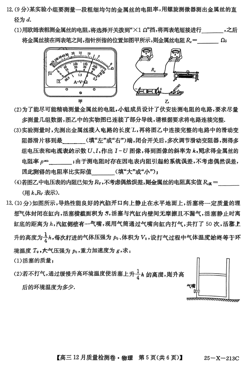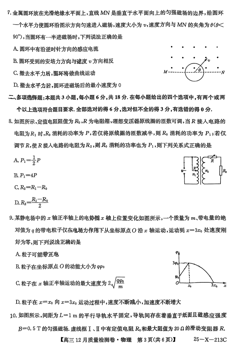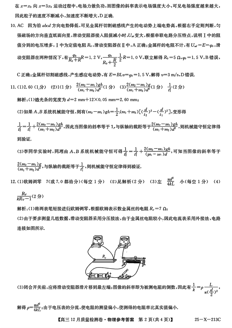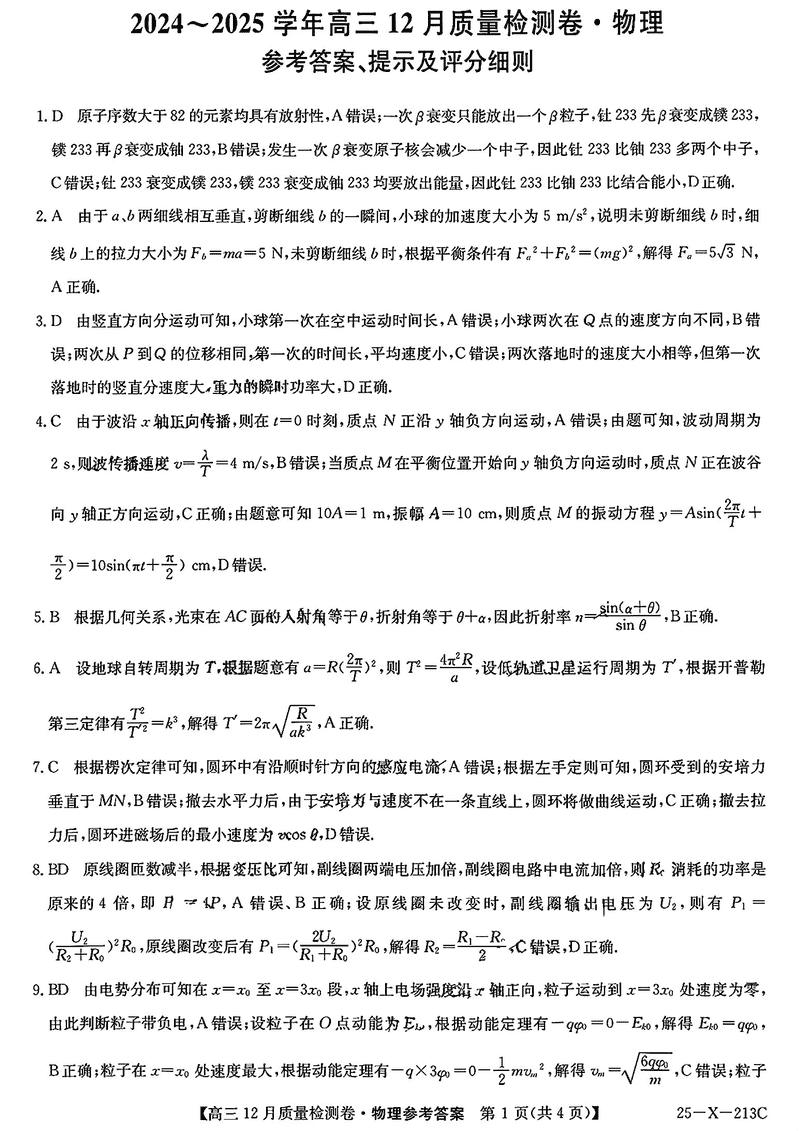 山西三晋卓越联盟2024年12月高三质检物理试题及答案