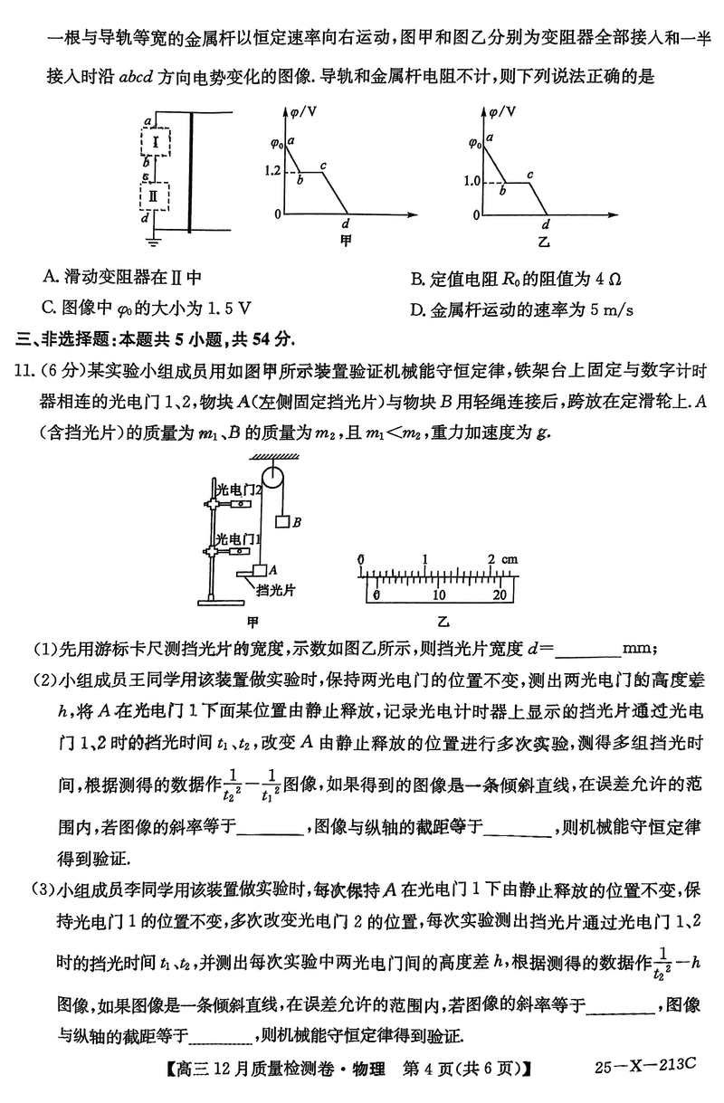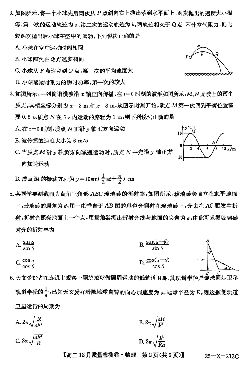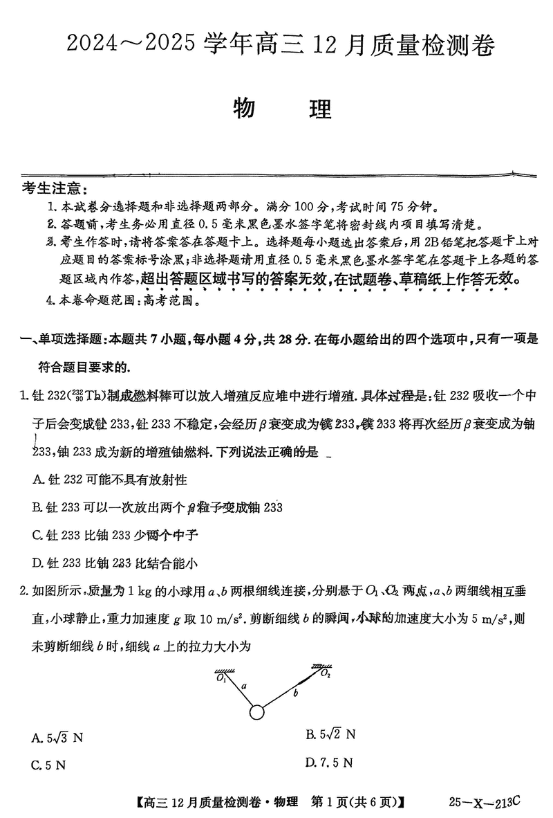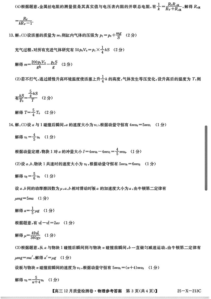 山西三晋卓越联盟2024年12月高三质检物理试题及答案