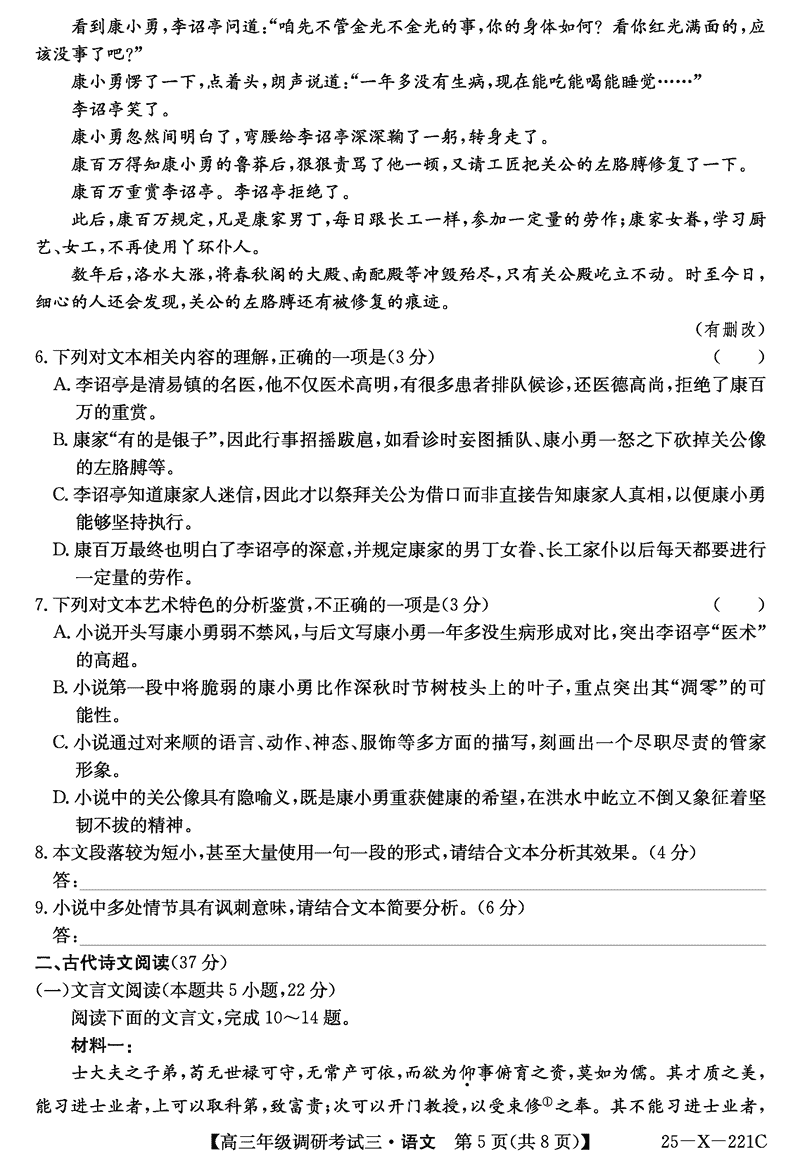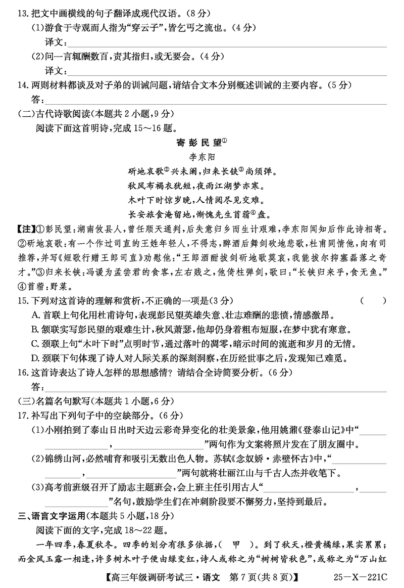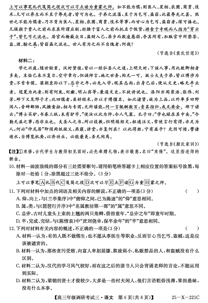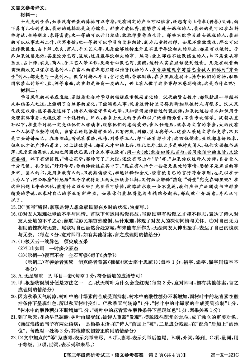 河南省TOP二十名校2025届高三上学期调研(三)语文试题及答案