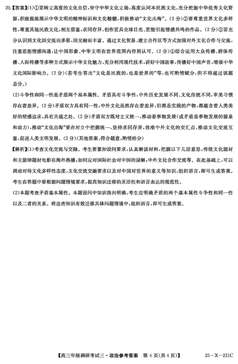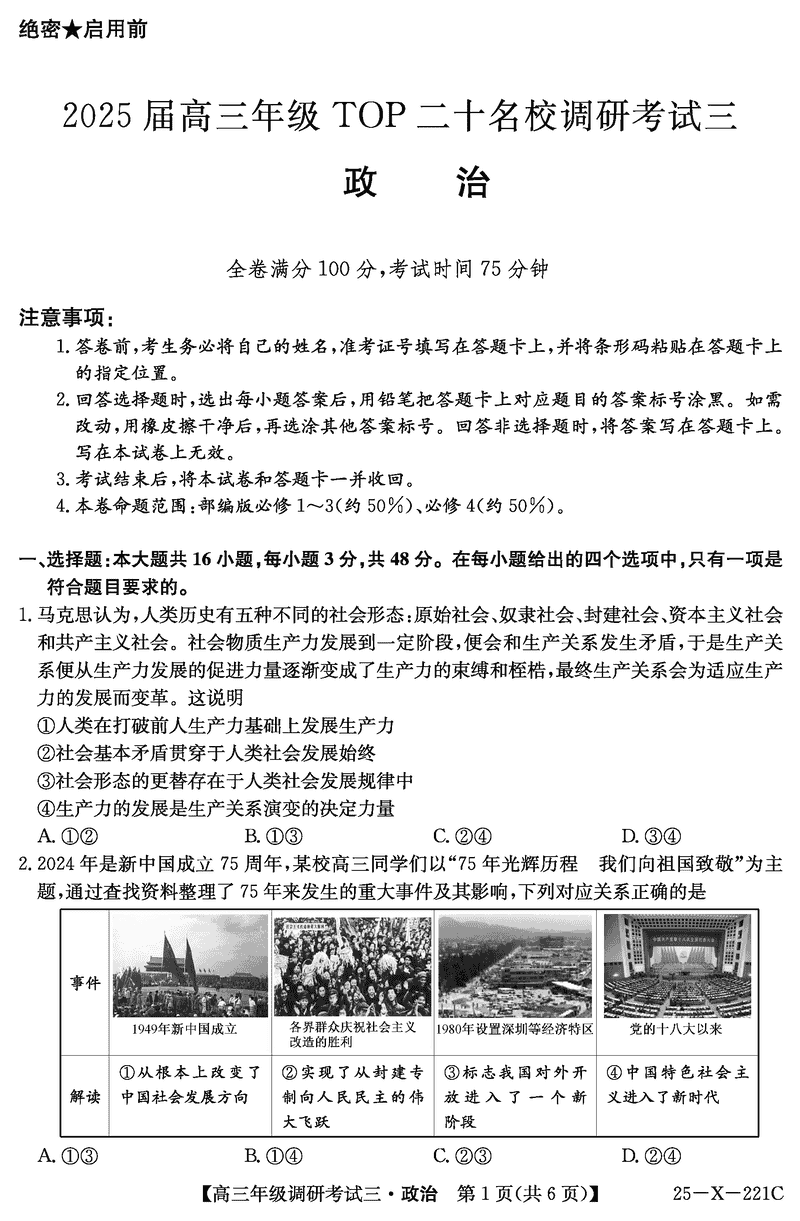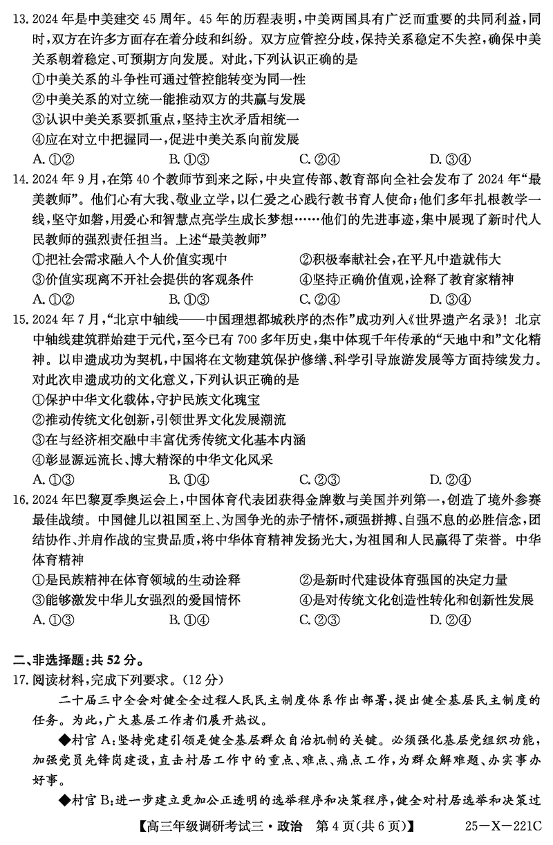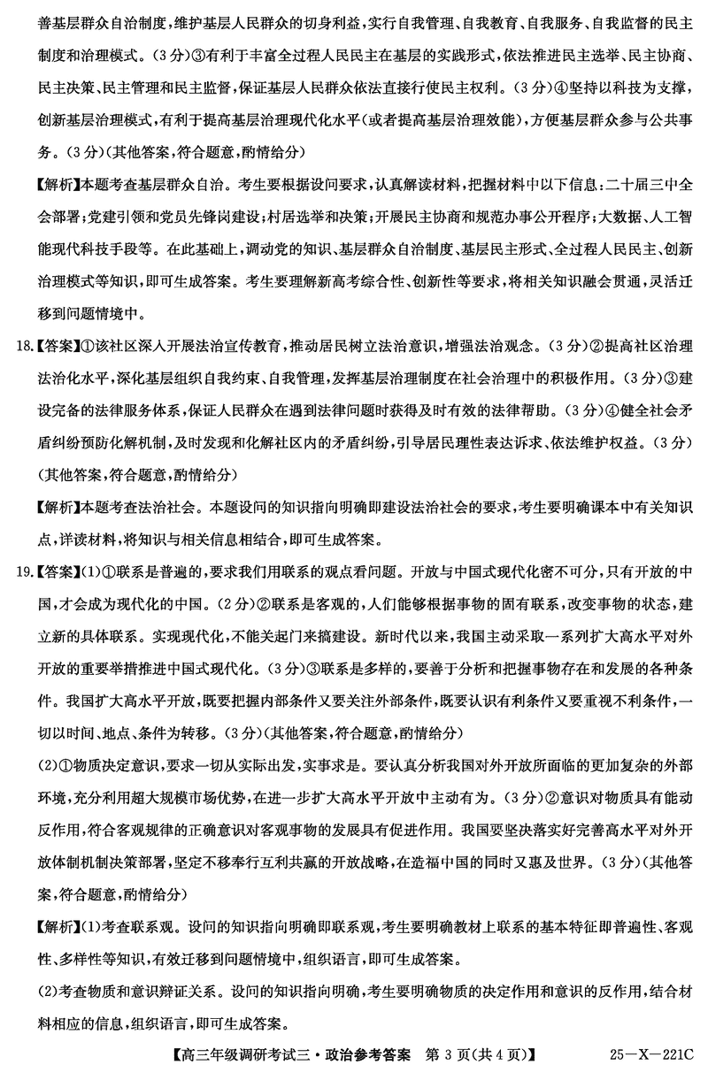 河南省TOP二十名校2025届高三上学期调研(三)政治试题及答案