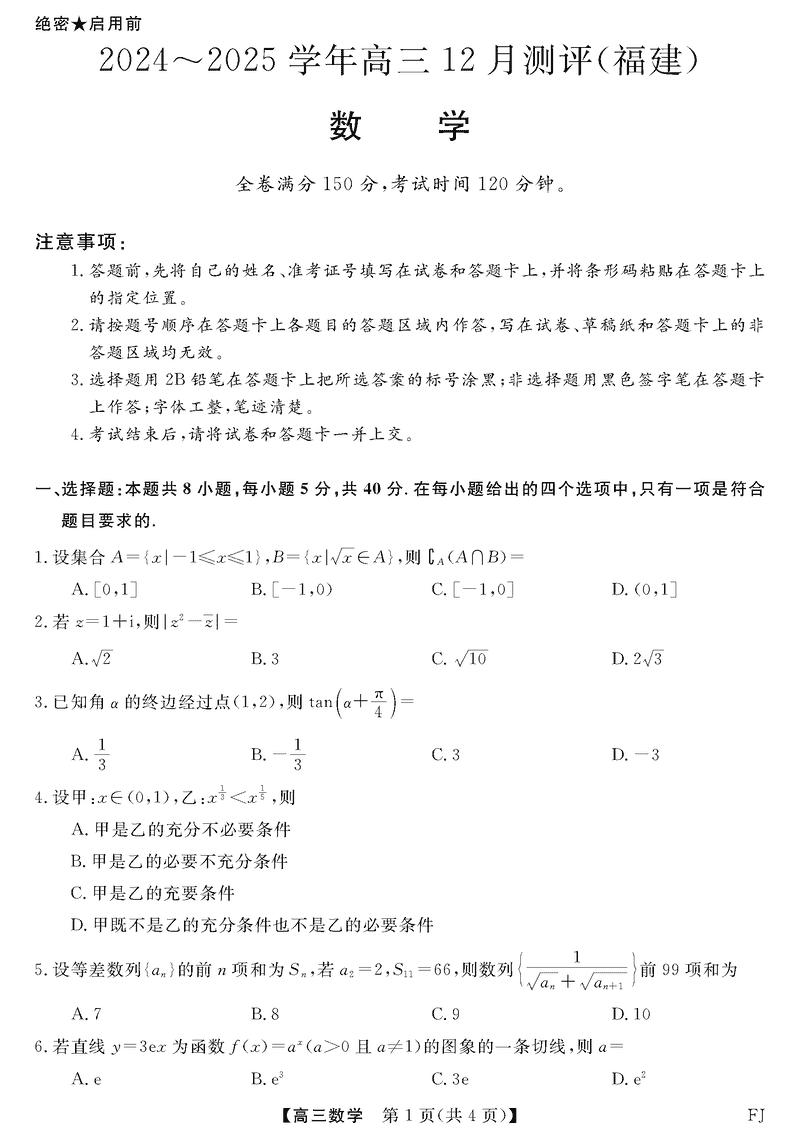 福建省金科大联考2024-2025学年高三12月测评数学试题及答案