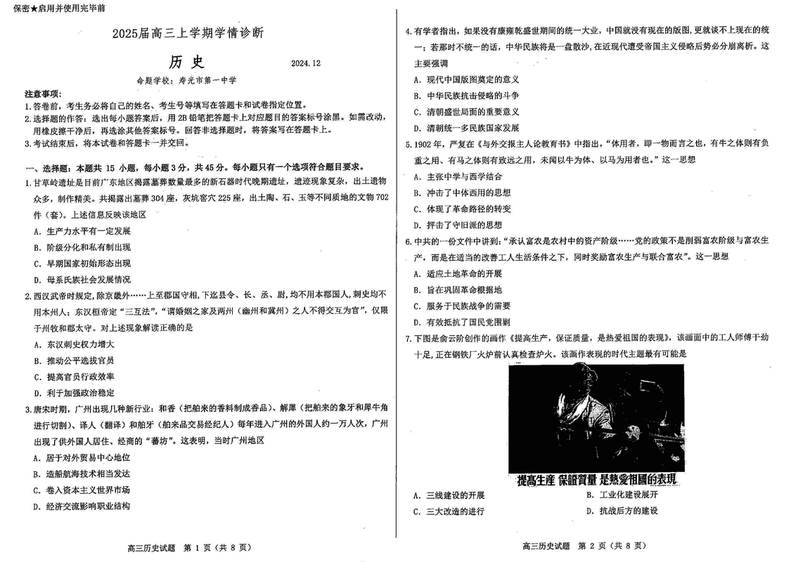 山东中学联盟百校大联考2025届高三上12月学情诊断历史试题及答案
