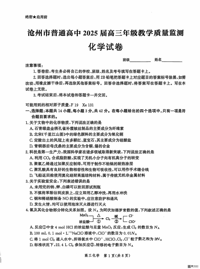 沧州市普通高中2025届高三12月教学质量监测化学试题及答案