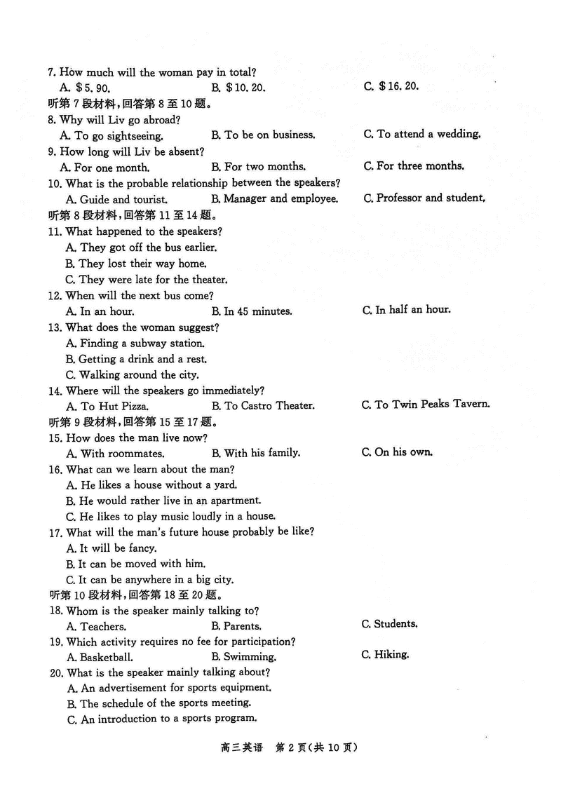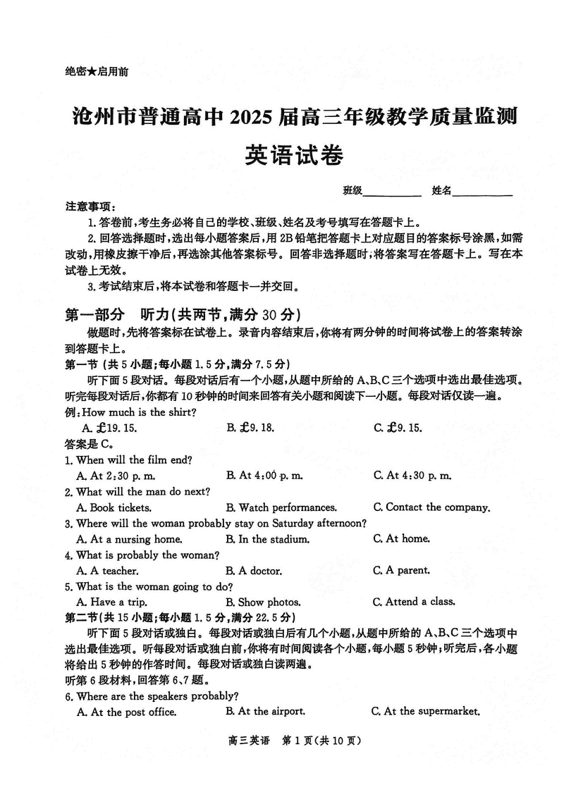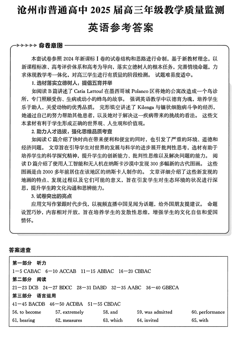 沧州市普通高中2025届高三12月教学质量监测英语考试已于近日开考,为方便考生考后及时查看考试情况,查漏补缺、弥补不足,本文整理了试题答案解析相关信息!