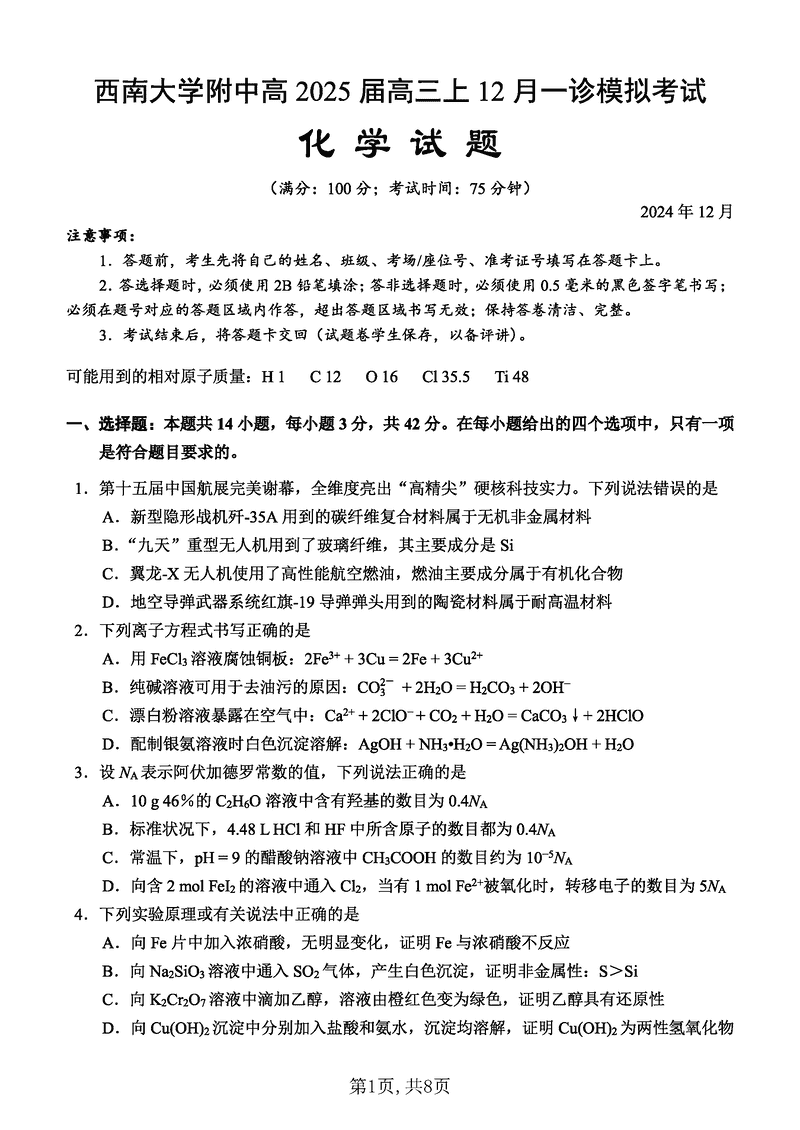 重庆西南大学附中2025届高三12月一诊模拟化学试题及答案