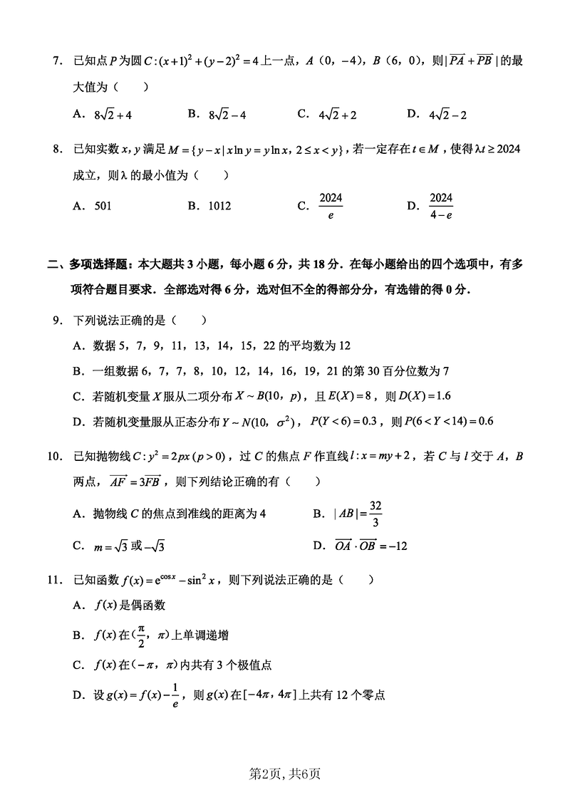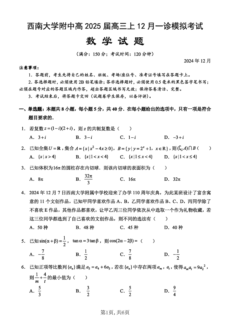 重庆西南大学附中2025届高三12月一诊模拟数学试题及答案