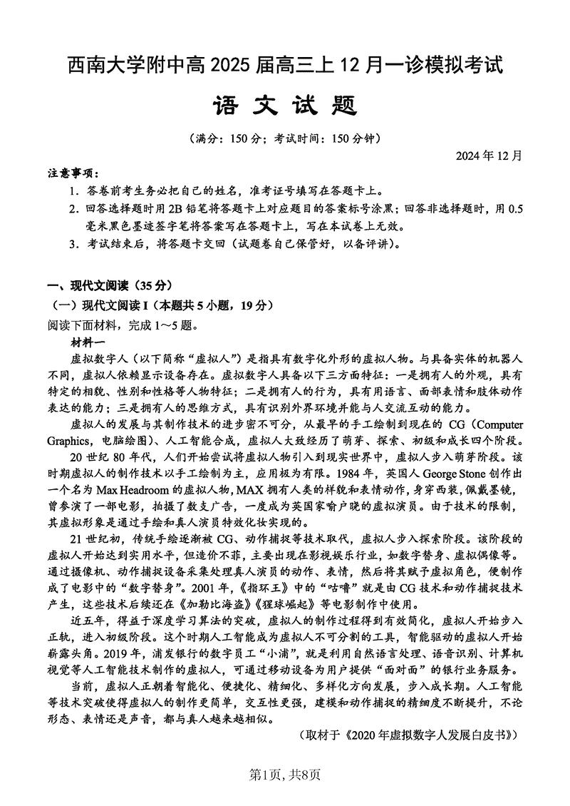 重庆西南大学附中2025届高三12月一诊模拟语文试题及答案