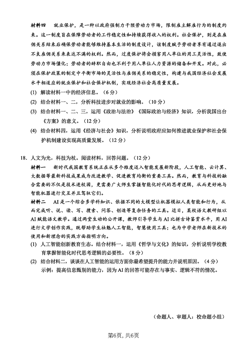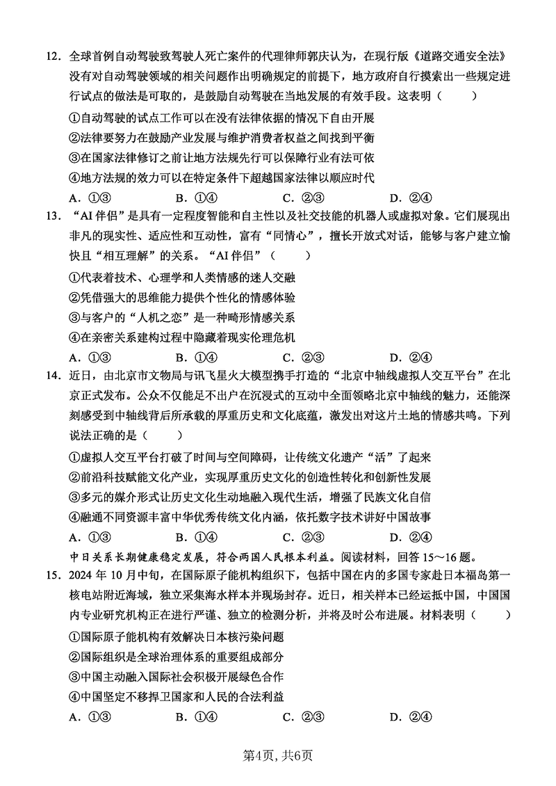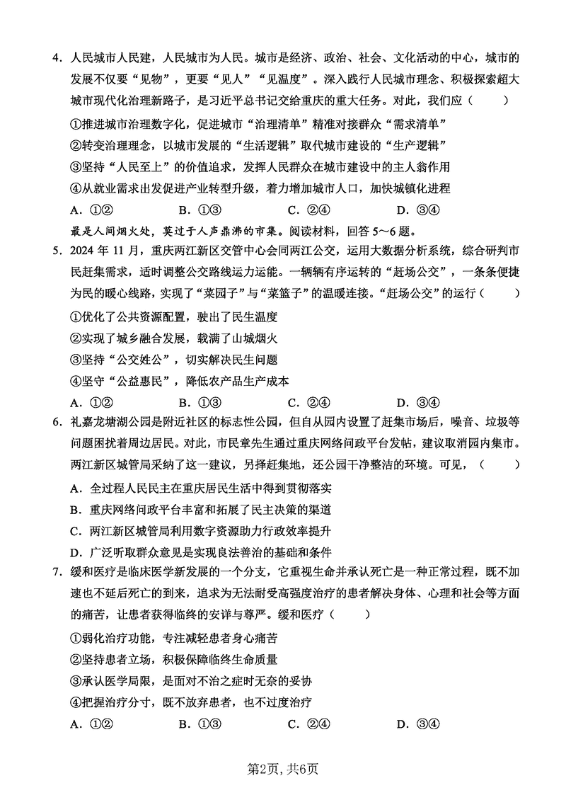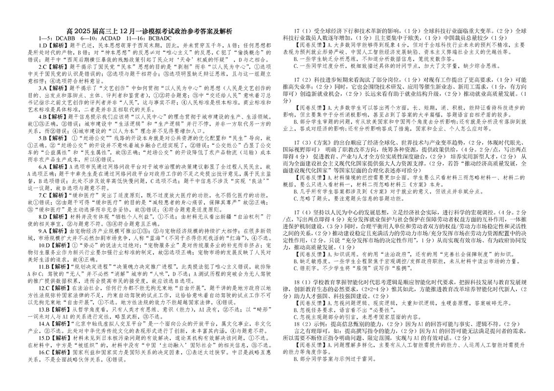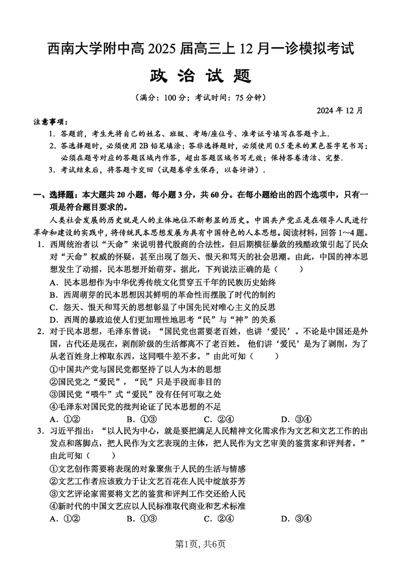 重庆西南大学附中2025届高三12月一诊模拟政治试题及答案