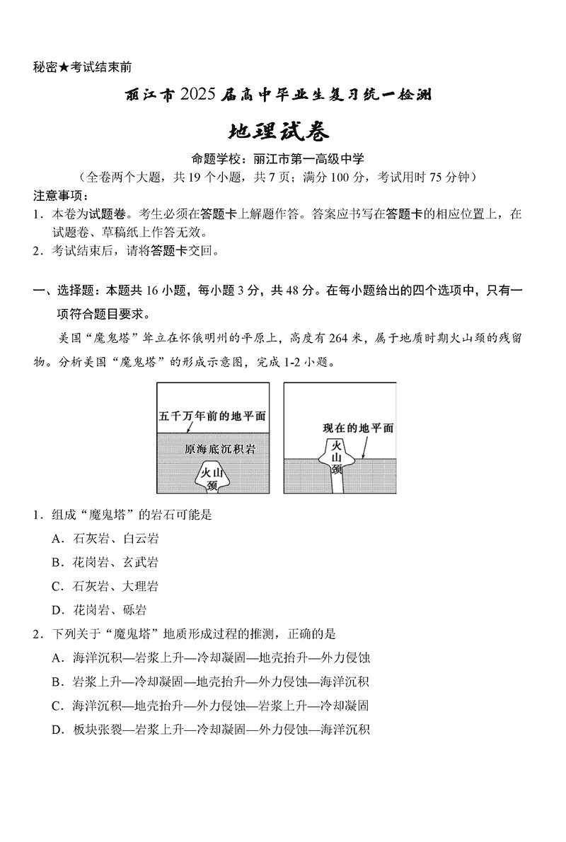 云南丽江2025届高中毕业生复习统一检测地理考试已于近日开考,为方便考生考后及时查看考试情况,查漏补缺、弥补不足,本文整理了试题答案解析相关信息!
