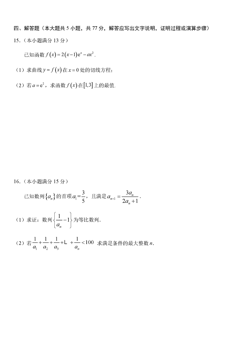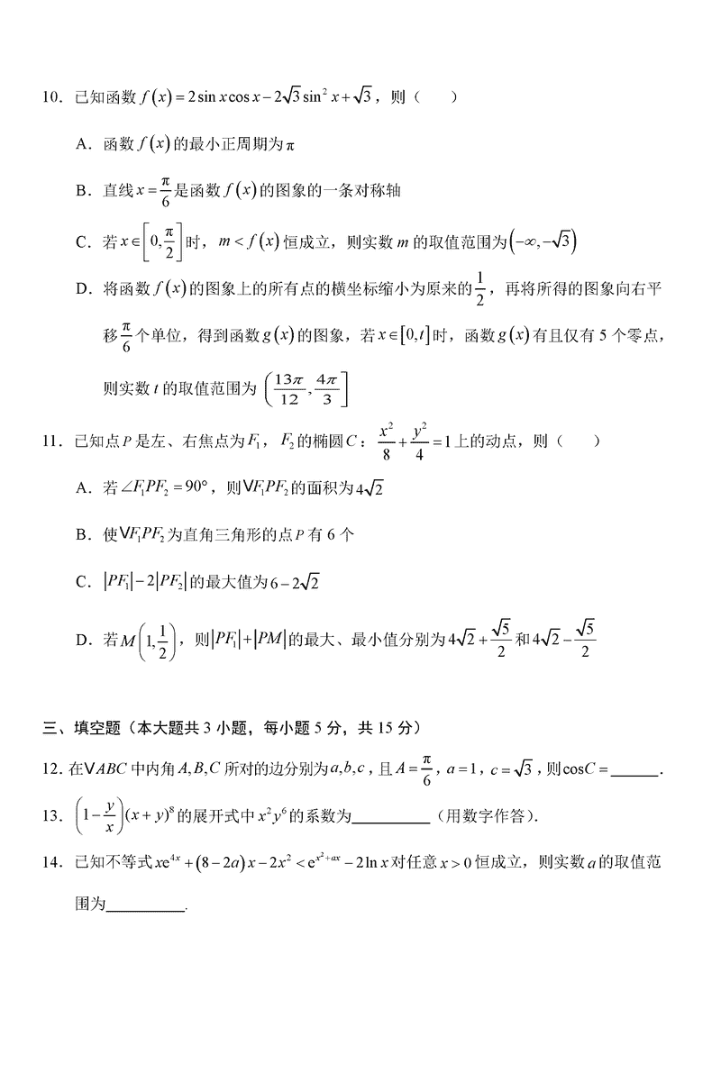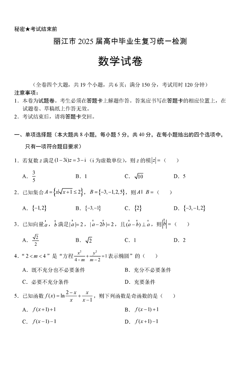 云南丽江2025届高中毕业生复习统一检测数学试题及答案