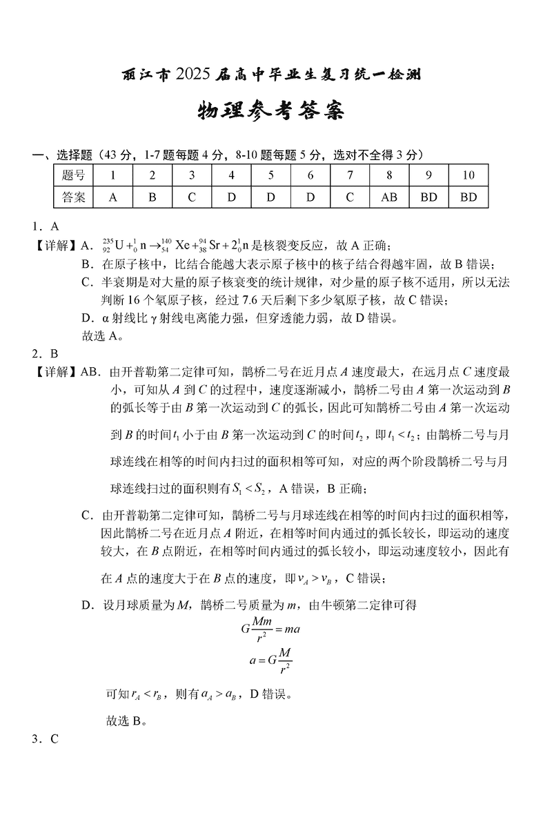 云南丽江2025届高中毕业生复习统一检测物理考试已于近日开考,为方便考生考后及时查看考试情况,查漏补缺、弥补不足,本文整理了试题答案解析相关信息!