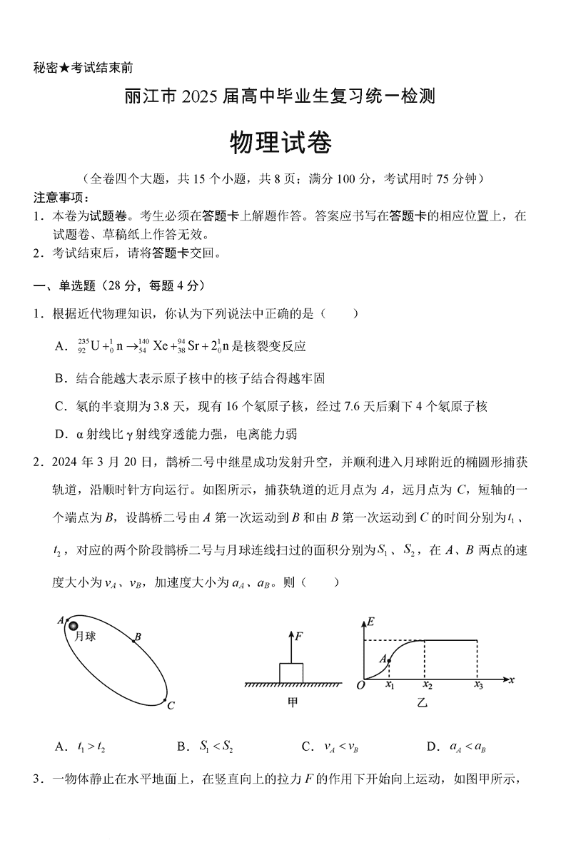 云南丽江2025届高中毕业生复习统一检测物理试题及答案