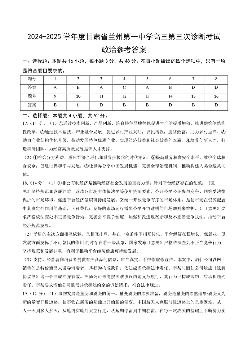 兰州一中2024-2025学年高三上第三次诊断政治试题及答案