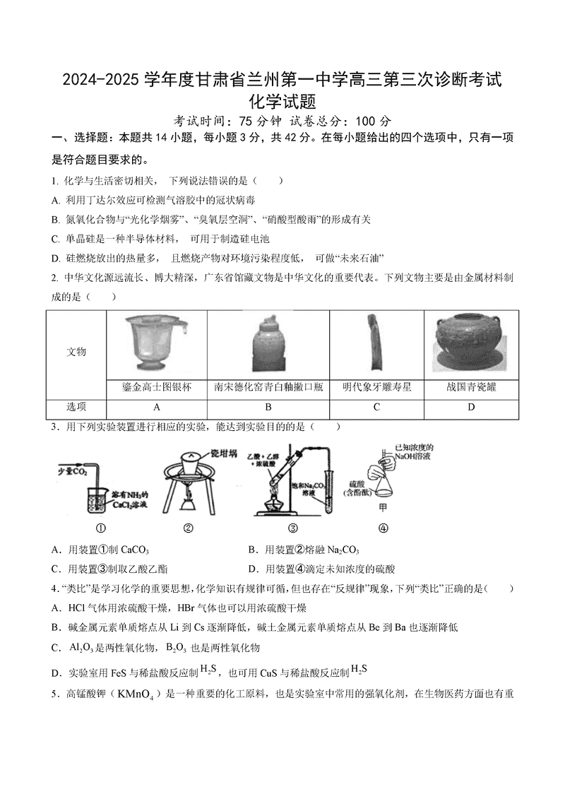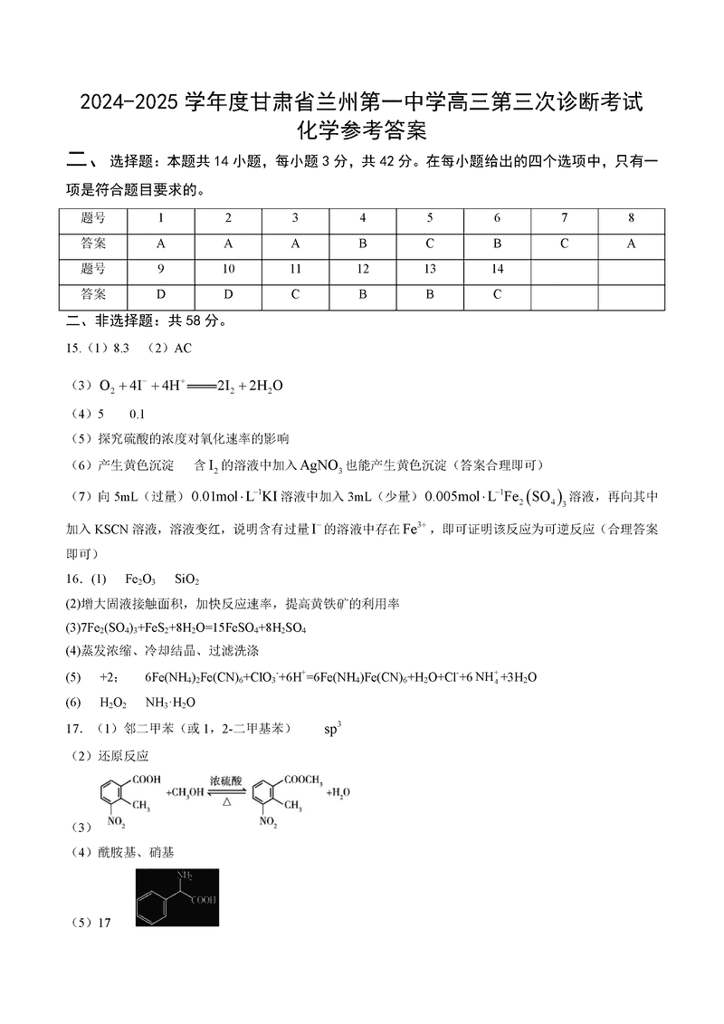 兰州一中2024-2025学年高三上第三次诊断化学考试已于近日开考,为方便考生考后及时查看考试情况,查漏补缺、弥补不足,本文整理了试题答案解析相关信息!