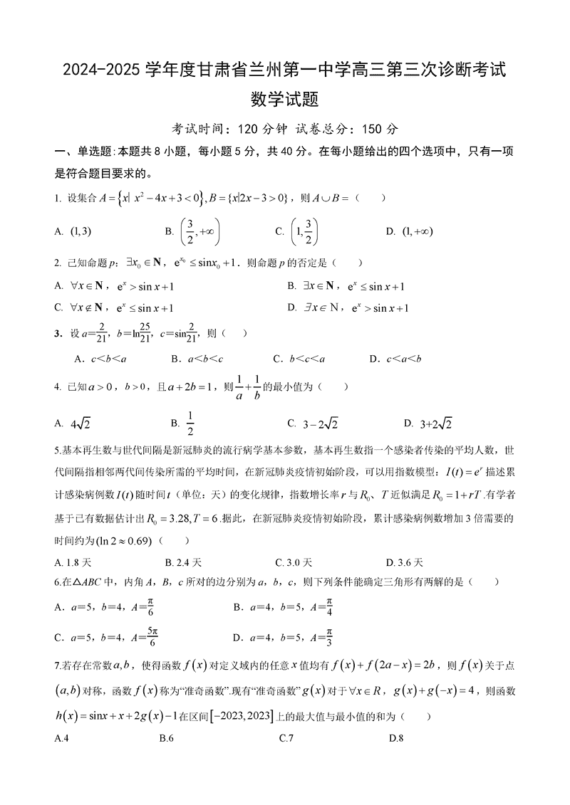 兰州一中2024-2025学年高三上第三次诊断数学试题及答案