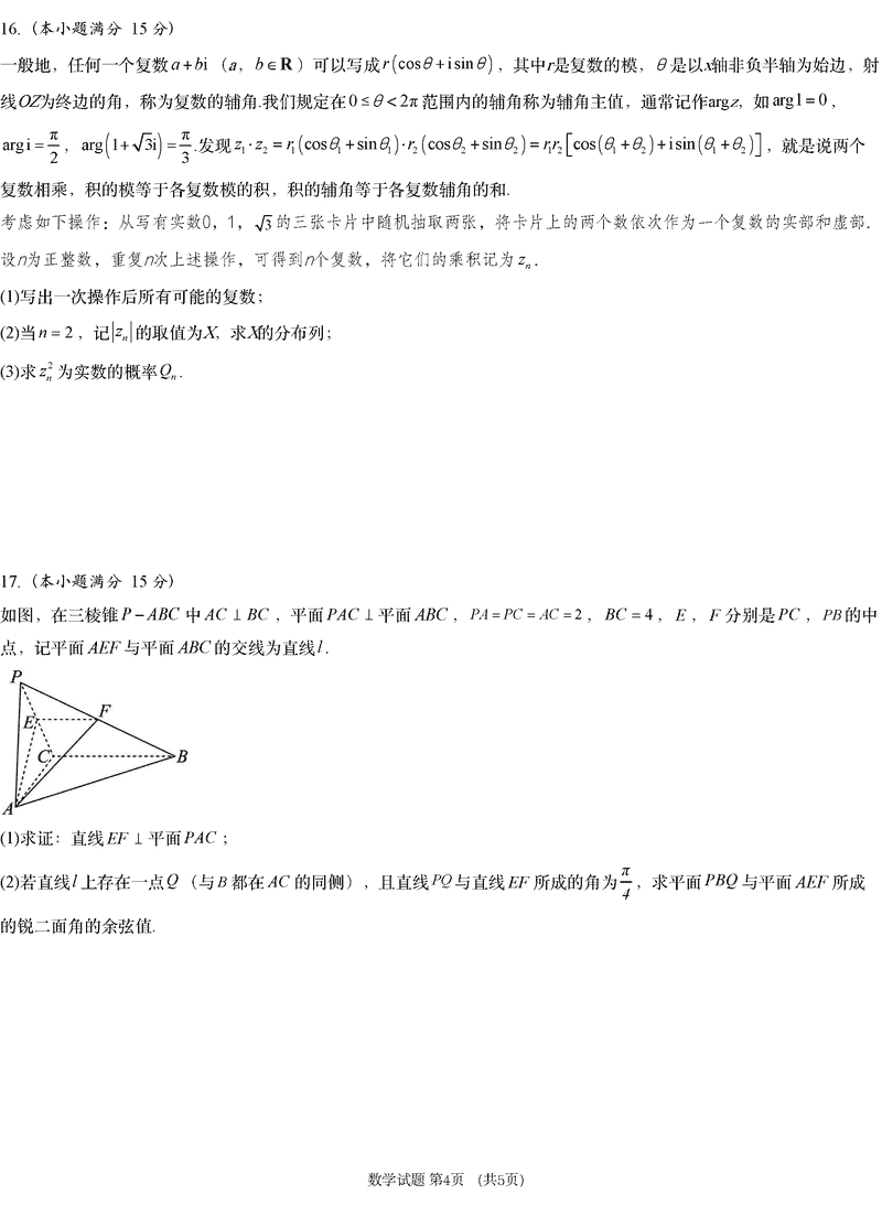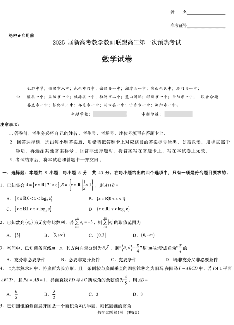 湖南长郡二十校联盟2025届高三上学期第一次预热数学试题及答案