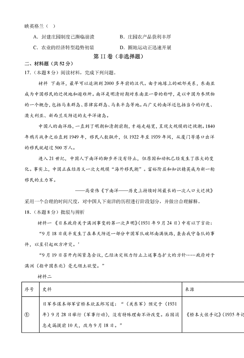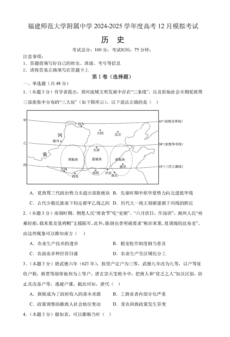 福建师大附中2024-2025学年高三上12月二模历史试题及答案