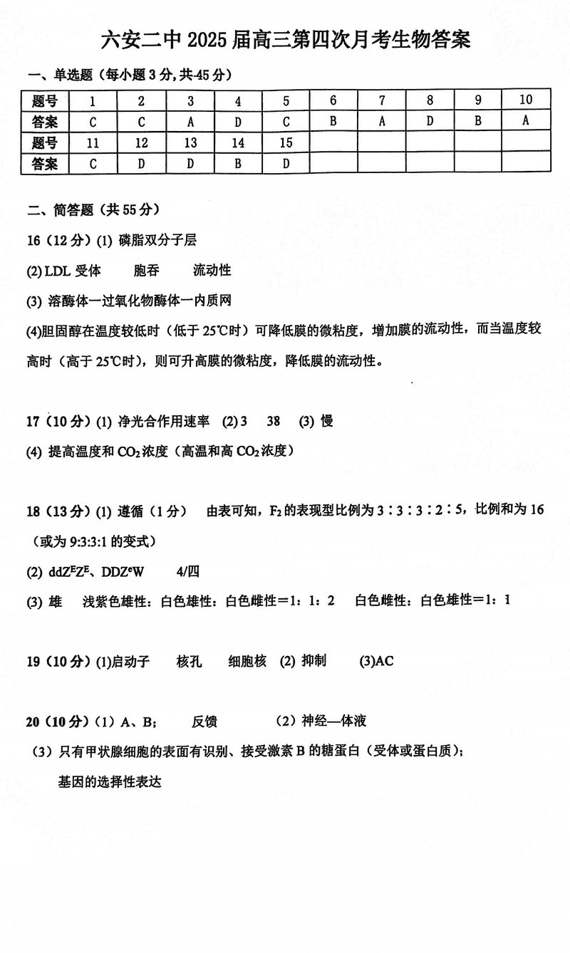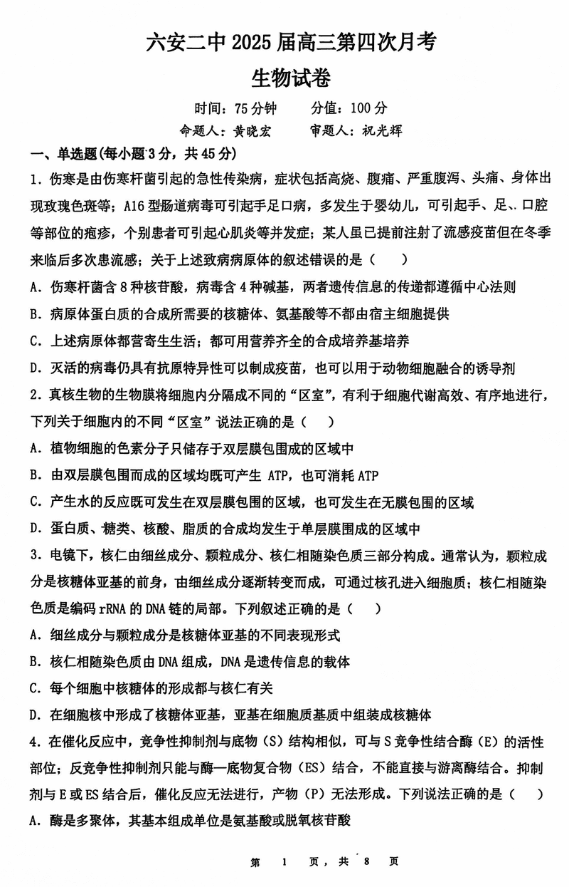 安徽六安二中2025届高三上学期12月第四次月考生物考试已于近日开考,为方便考生考后及时查看考试情况,查漏补缺、弥补不足,本文整理了试题答案解析相关信息!