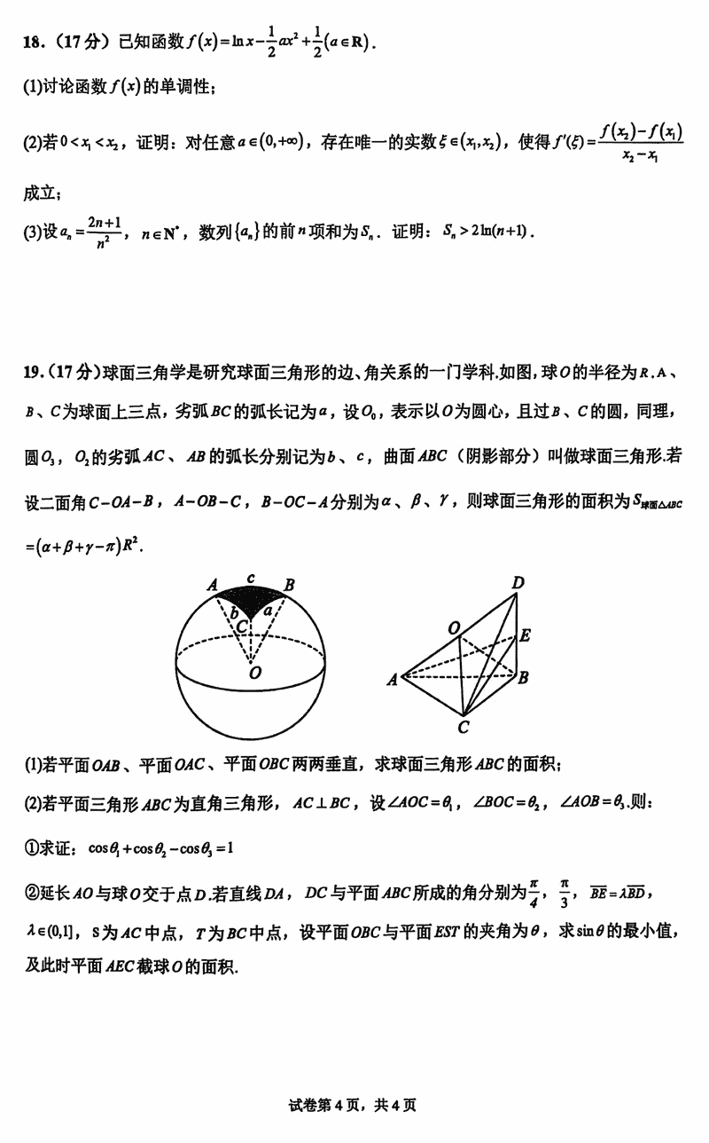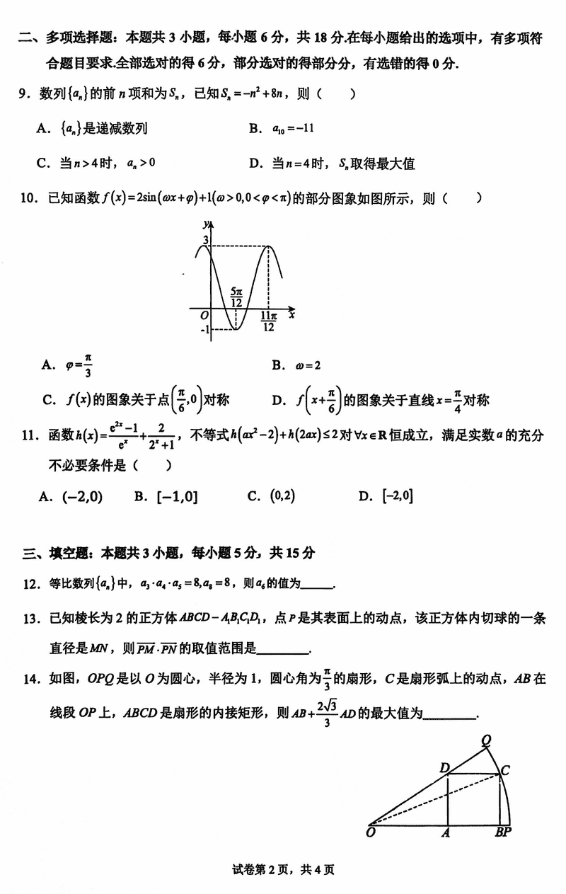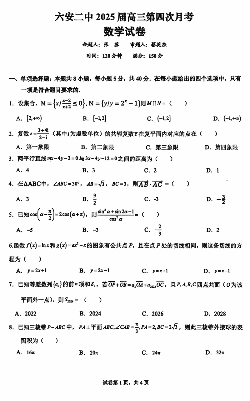 六安二中2025届高三上学期12月第四次月考数学试题及答案