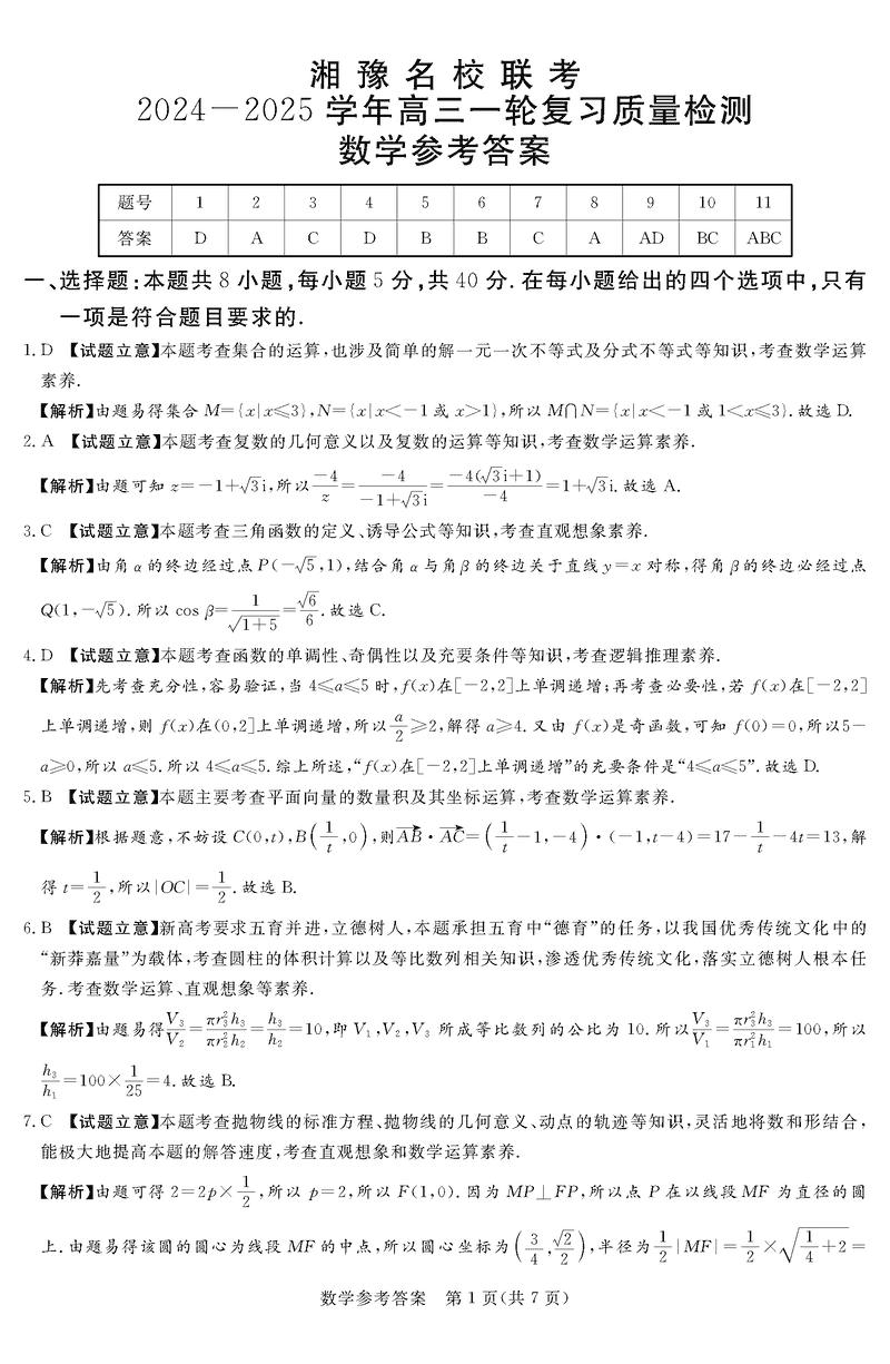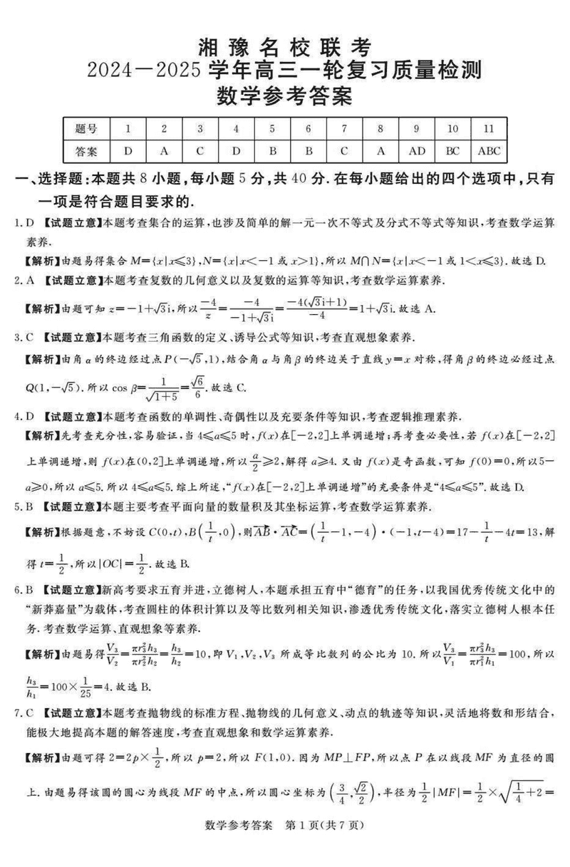 湘豫名校联考2024-2025学年高三上一轮复习质检数学考试已于近日开考,为方便考生考后及时查看考试情况,查漏补缺、弥补不足,本文整理了试题答案解析相关信息!