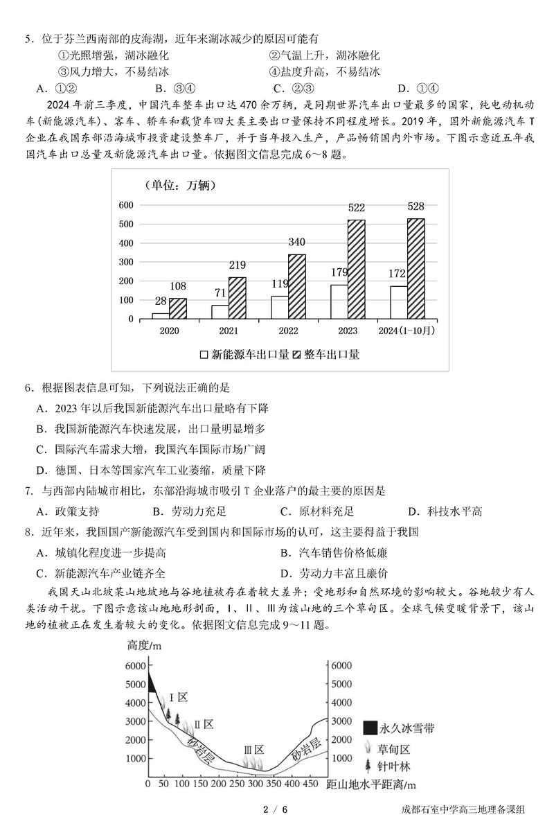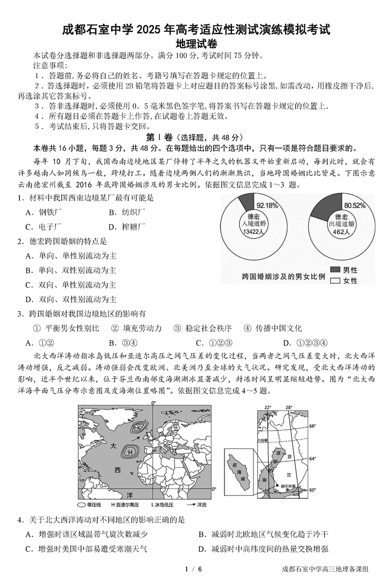 成都石室中学2025年高考适应性测试演练八省联考模拟地理试题及答案