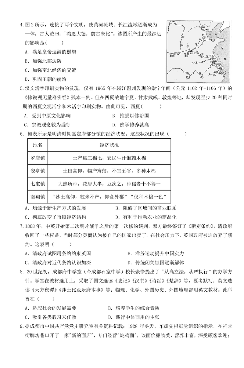 成都石室中学2025年高考适应性测试演练八省联考模拟历史试题及答案