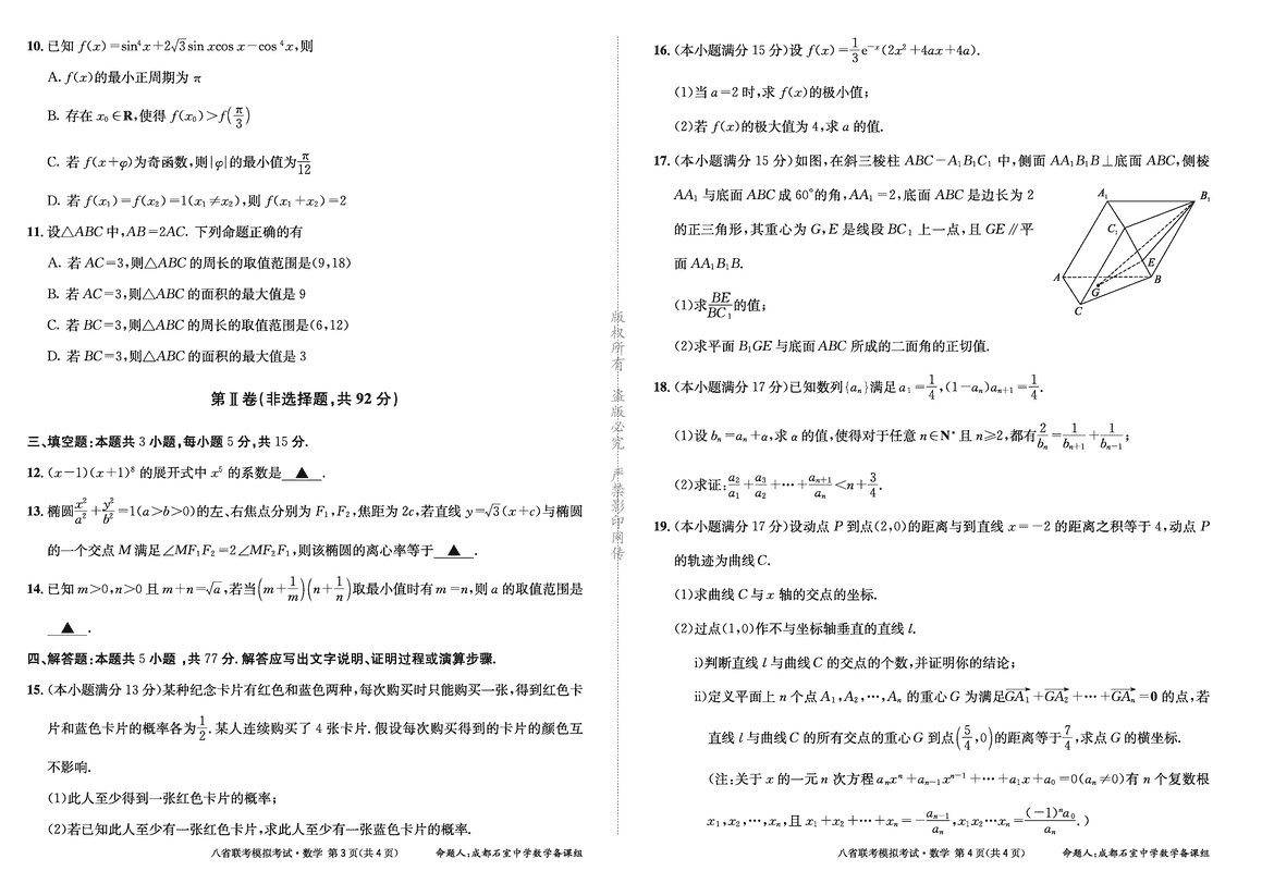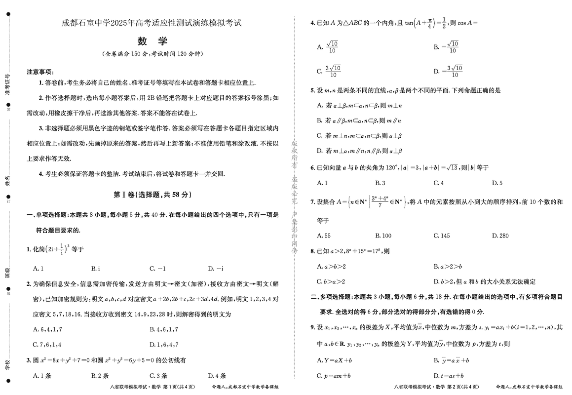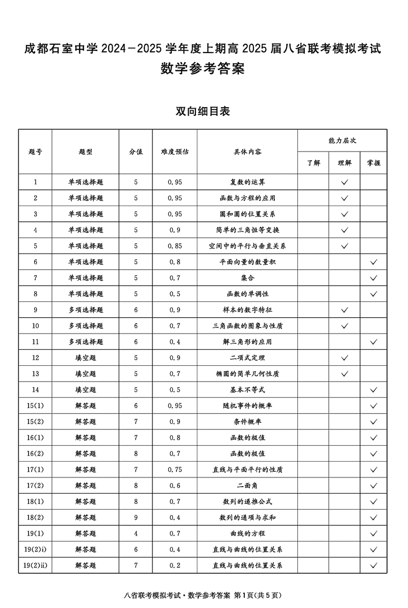 成都石室中学2025年高考适应性测试演练八省联考模拟数学考试已于近日开考,为方便考生考后及时查看考试情况,查漏补缺、弥补不足,本文整理了试题答案解析相关信息!
