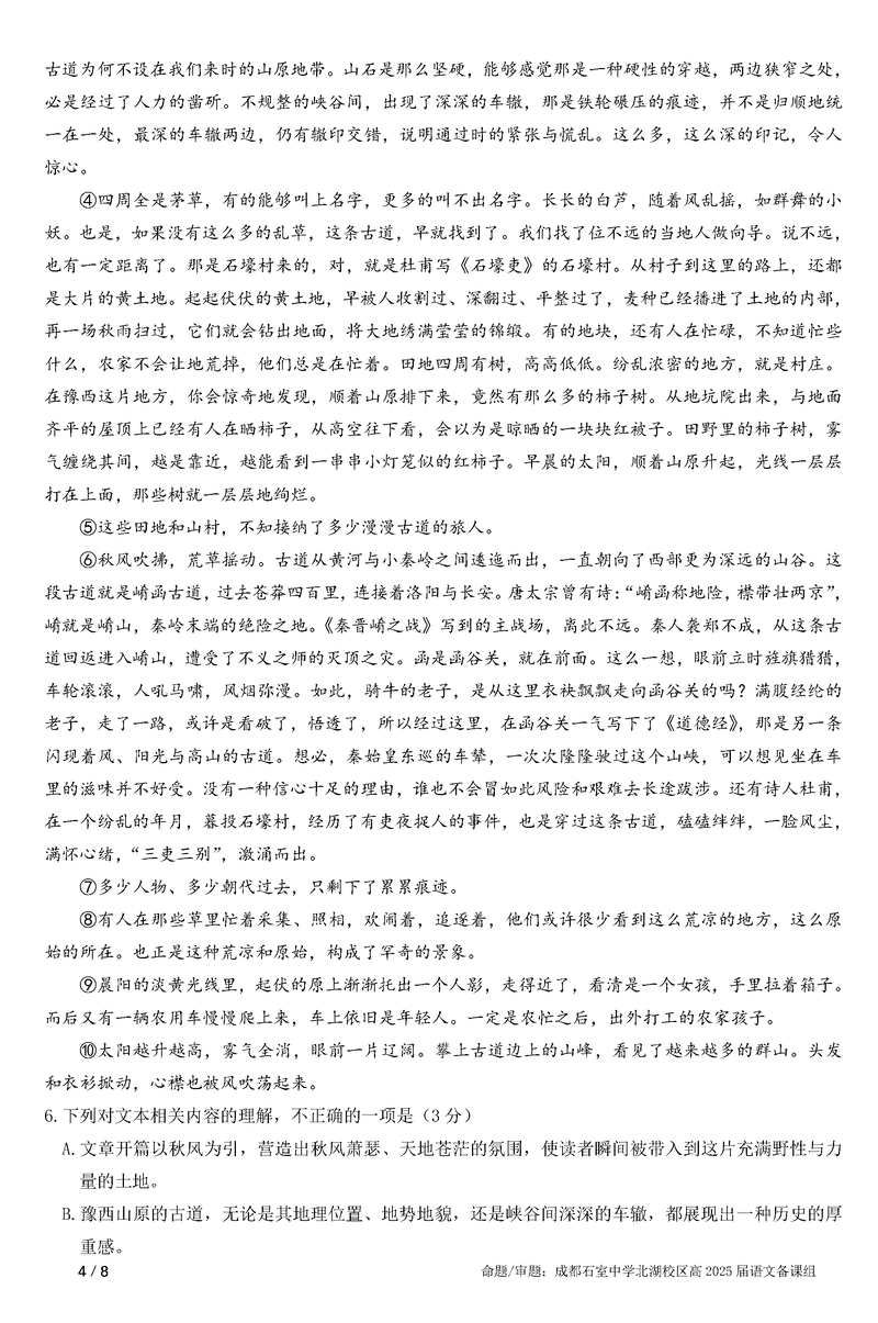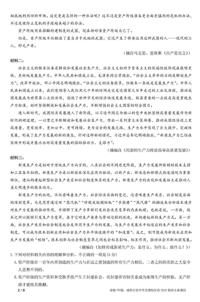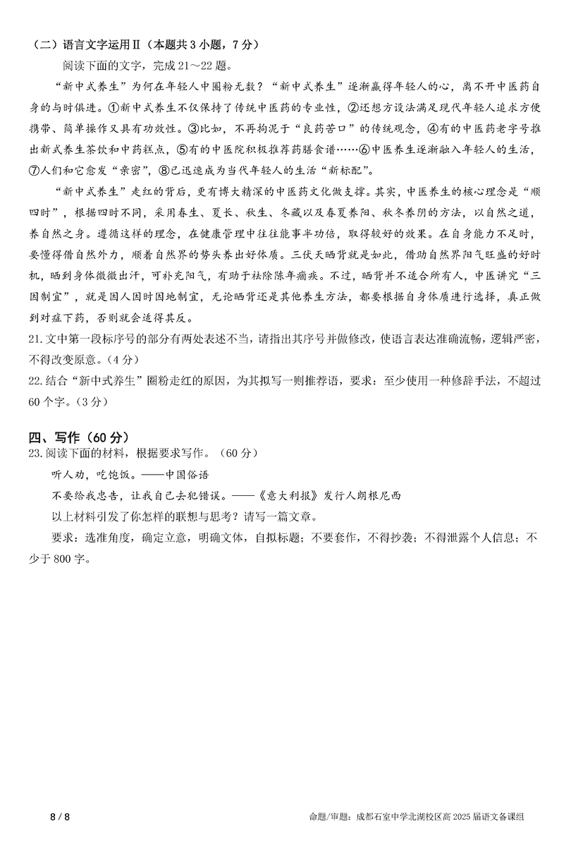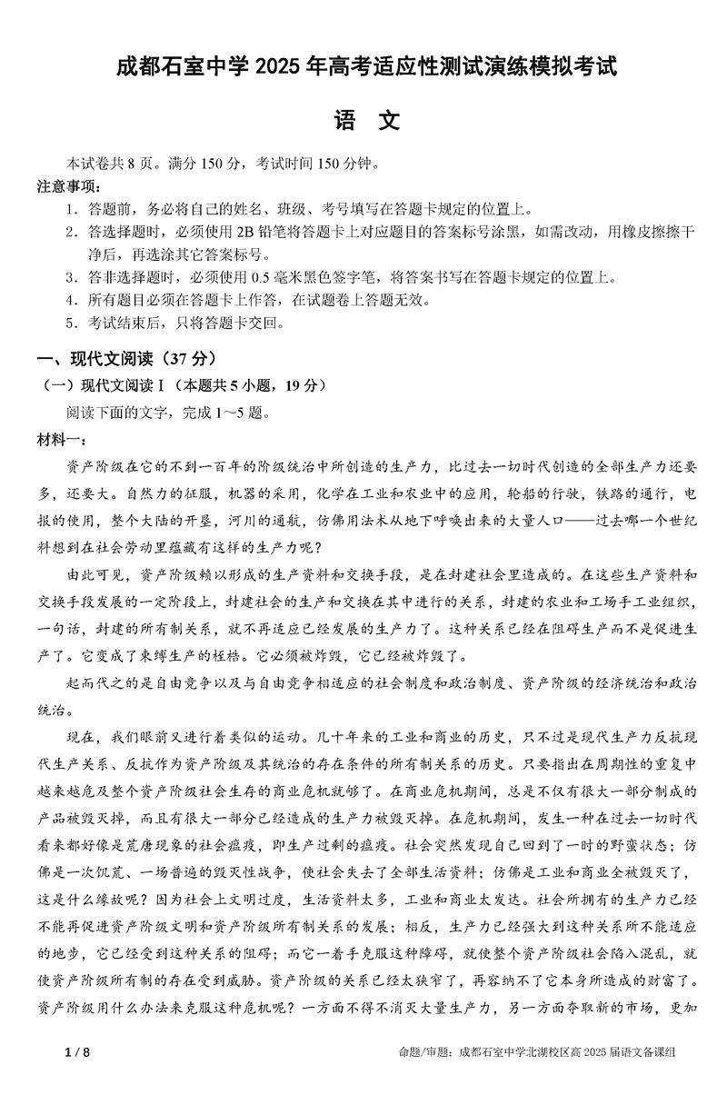 成都石室中学2025年高考适应性测试演练八省联考模拟语文试题及答案