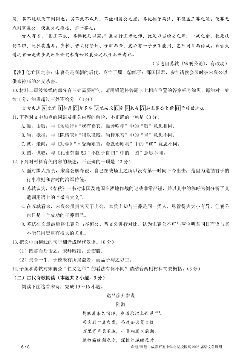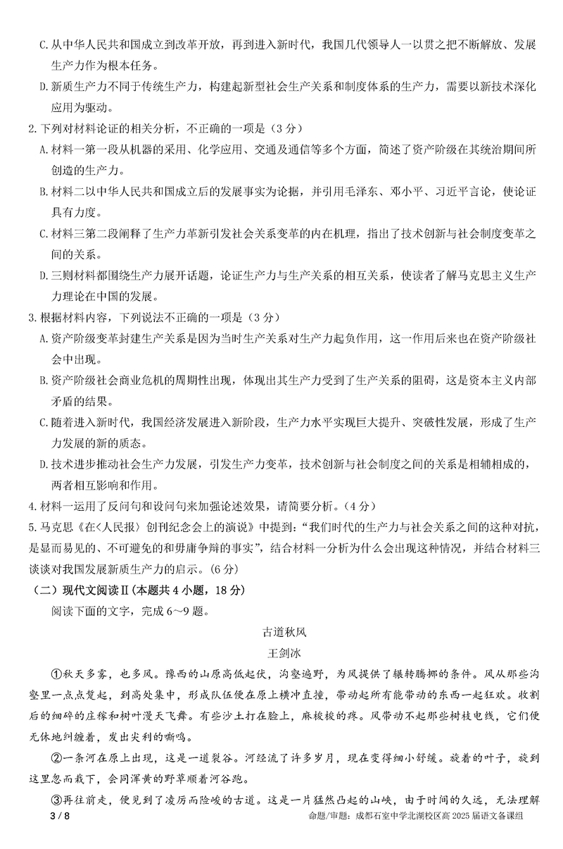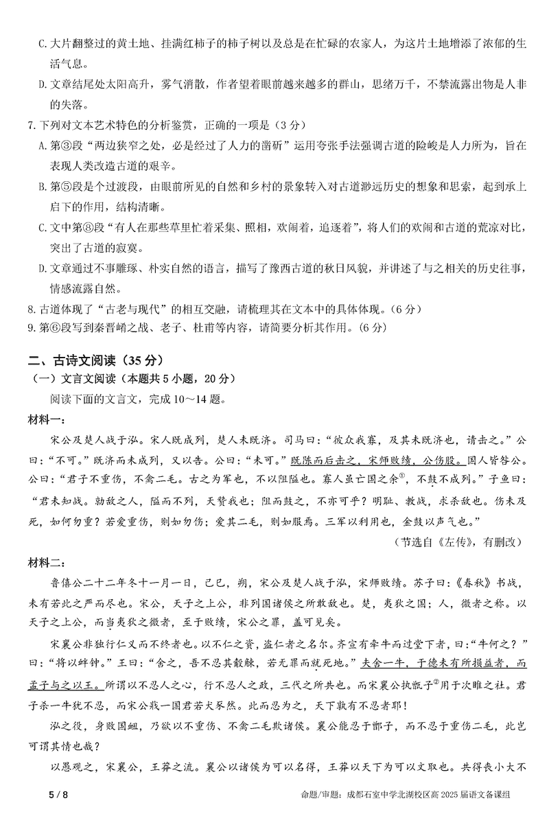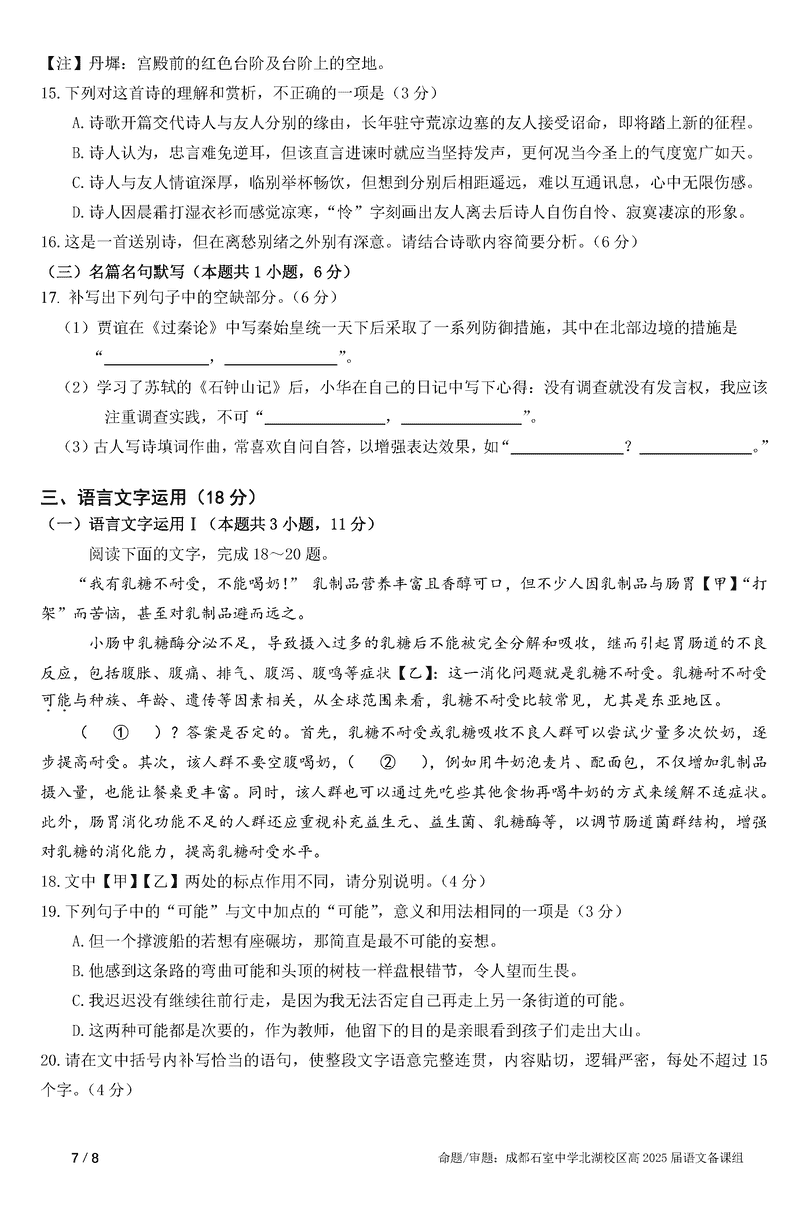 成都石室中学2025年高考适应性测试演练八省联考模拟语文试题及答案