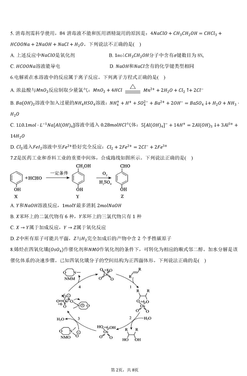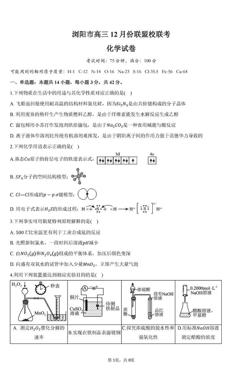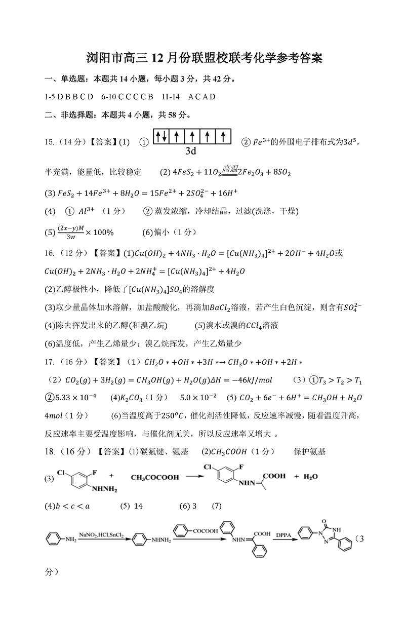 湖南浏阳市联盟校2024年高三上学期12月联考化学试题及答案