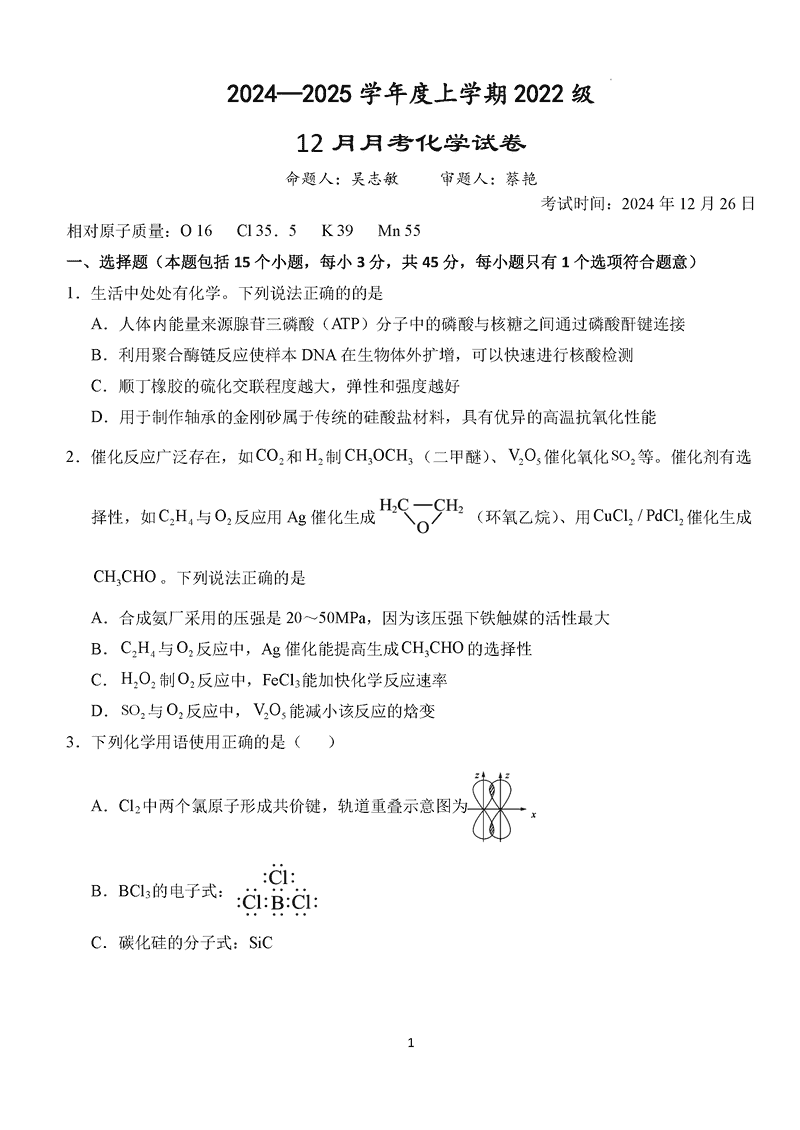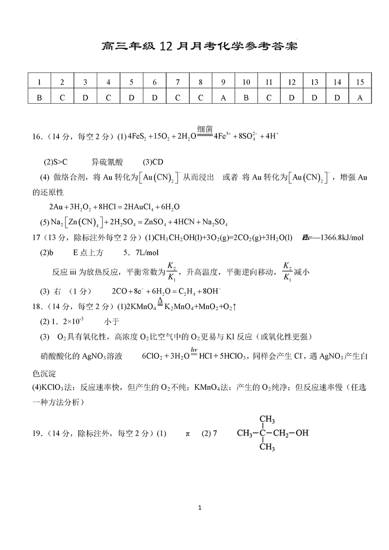 湖北沙市中学2024-2025学年高三上12月月考化学考试已于近日开考,为方便考生考后及时查看考试情况,查漏补缺、弥补不足,本文整理了试题答案解析相关信息!