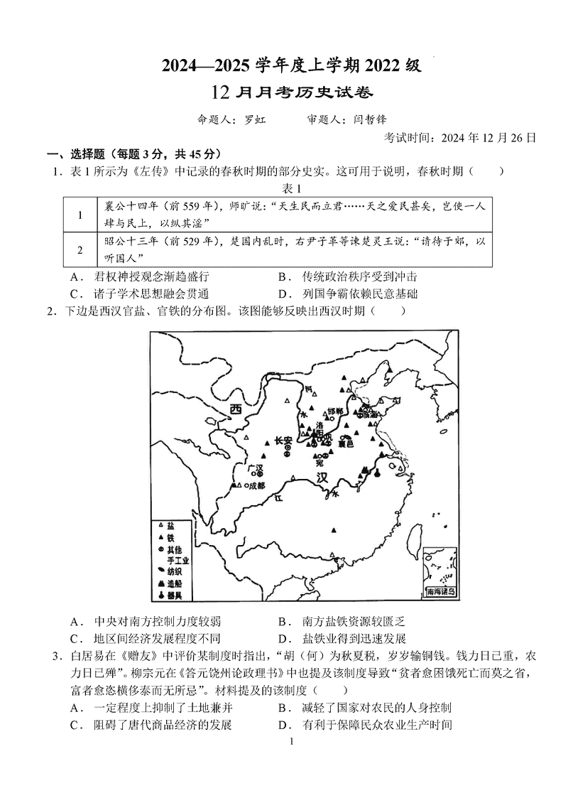 湖北沙市中学2024-2025学年高三上12月月考历史试题及答案