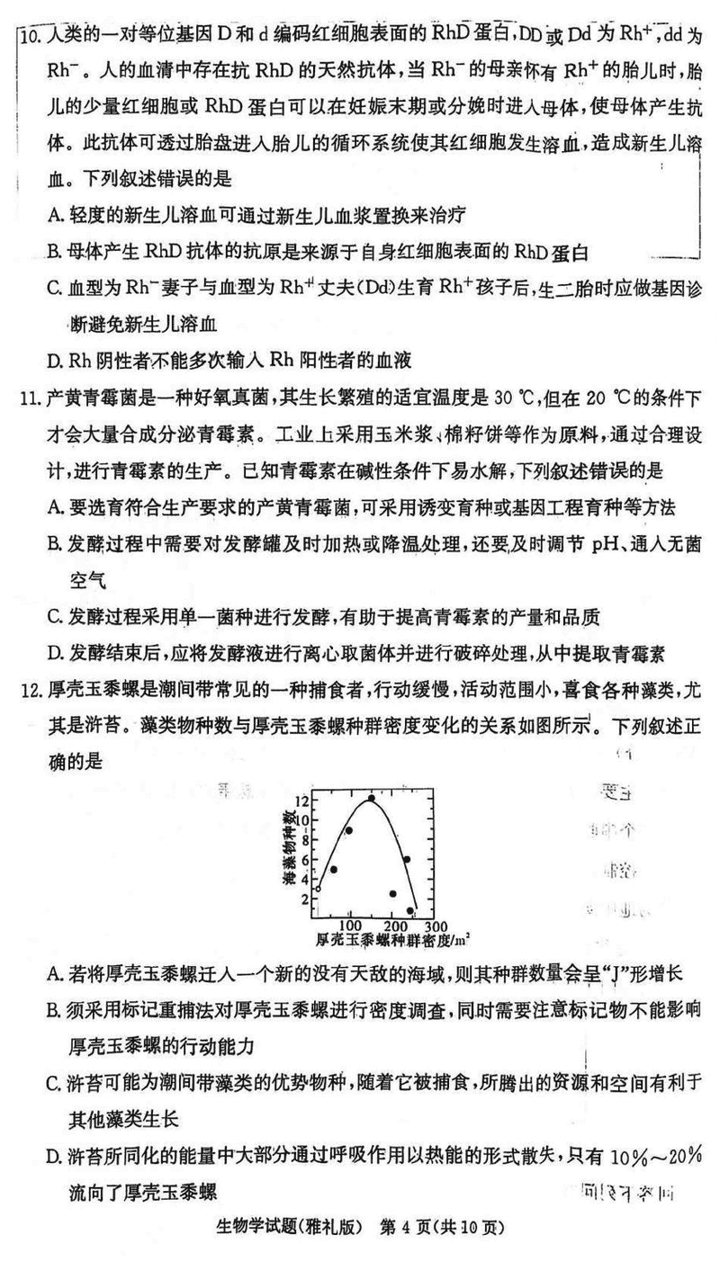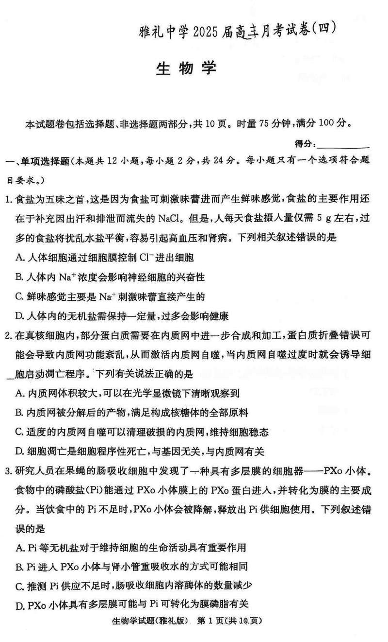 长沙雅礼中学2024-2025学年高三上学期月考(四)生物试题及答案