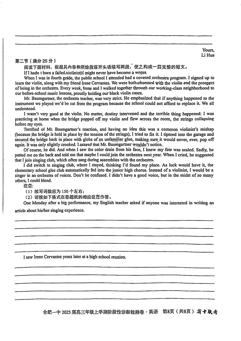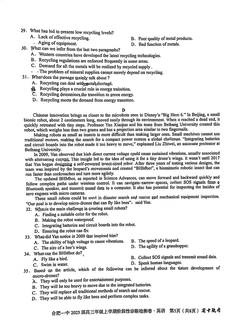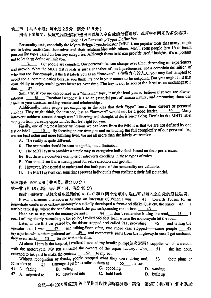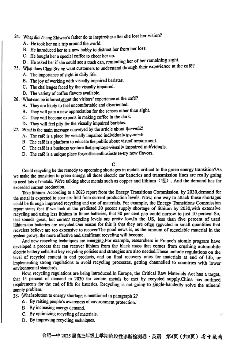 安徽省十联考合肥一中2025届高三上学期阶段性诊断检测英语试题及答案