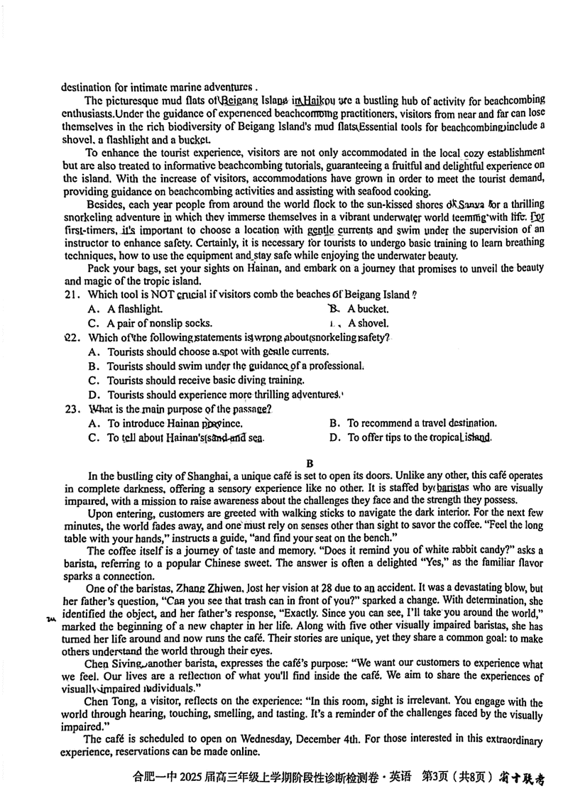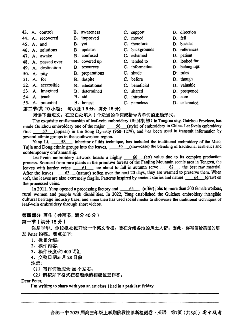 安徽省十联考合肥一中2025届高三上学期阶段性诊断检测英语考试已于近日开考,为方便考生考后及时查看考试情况,查漏补缺、弥补不足,本文整理了试题答案解析相关信息!