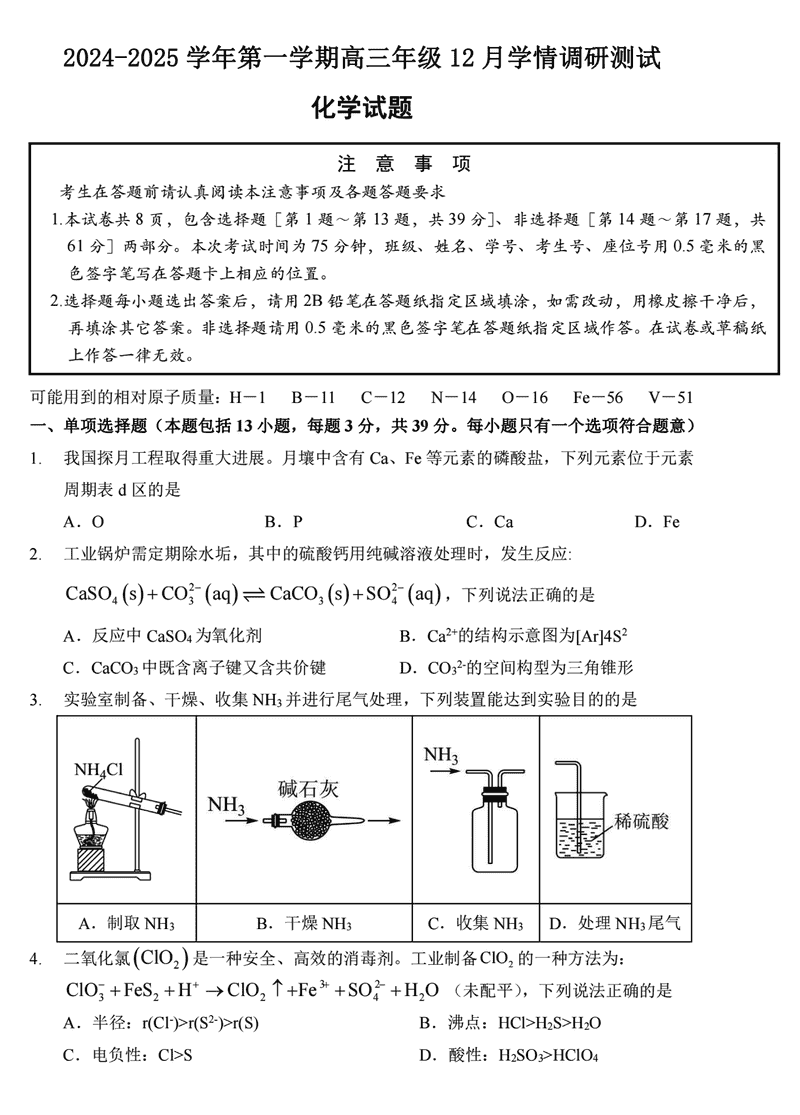扬州市高邮市2024-2025学年高三上学期12月月考化学试题及答案