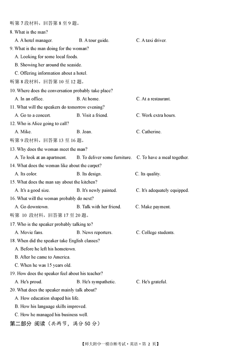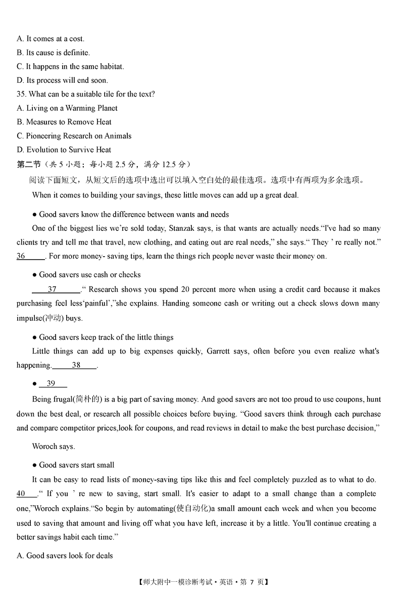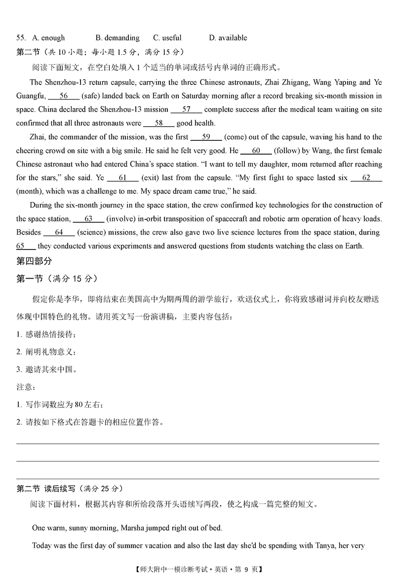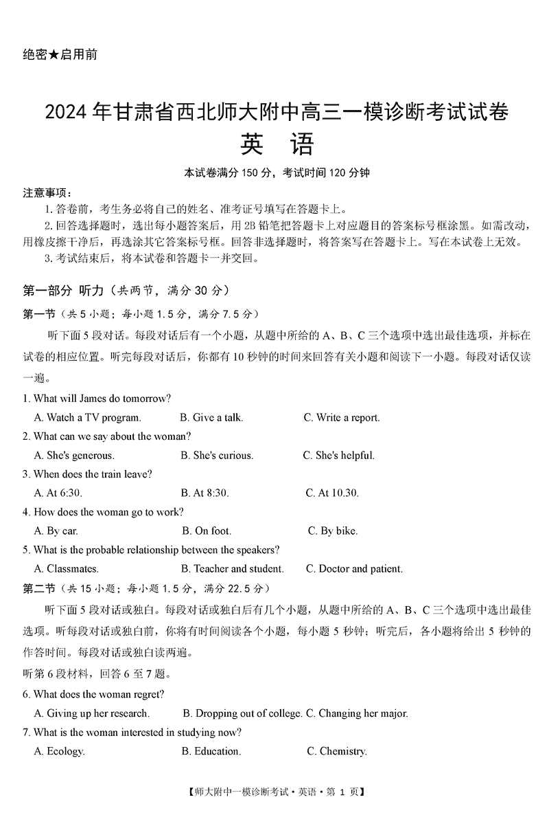 甘肃西北师大附中2025届高三上学期一模英语试题及答案