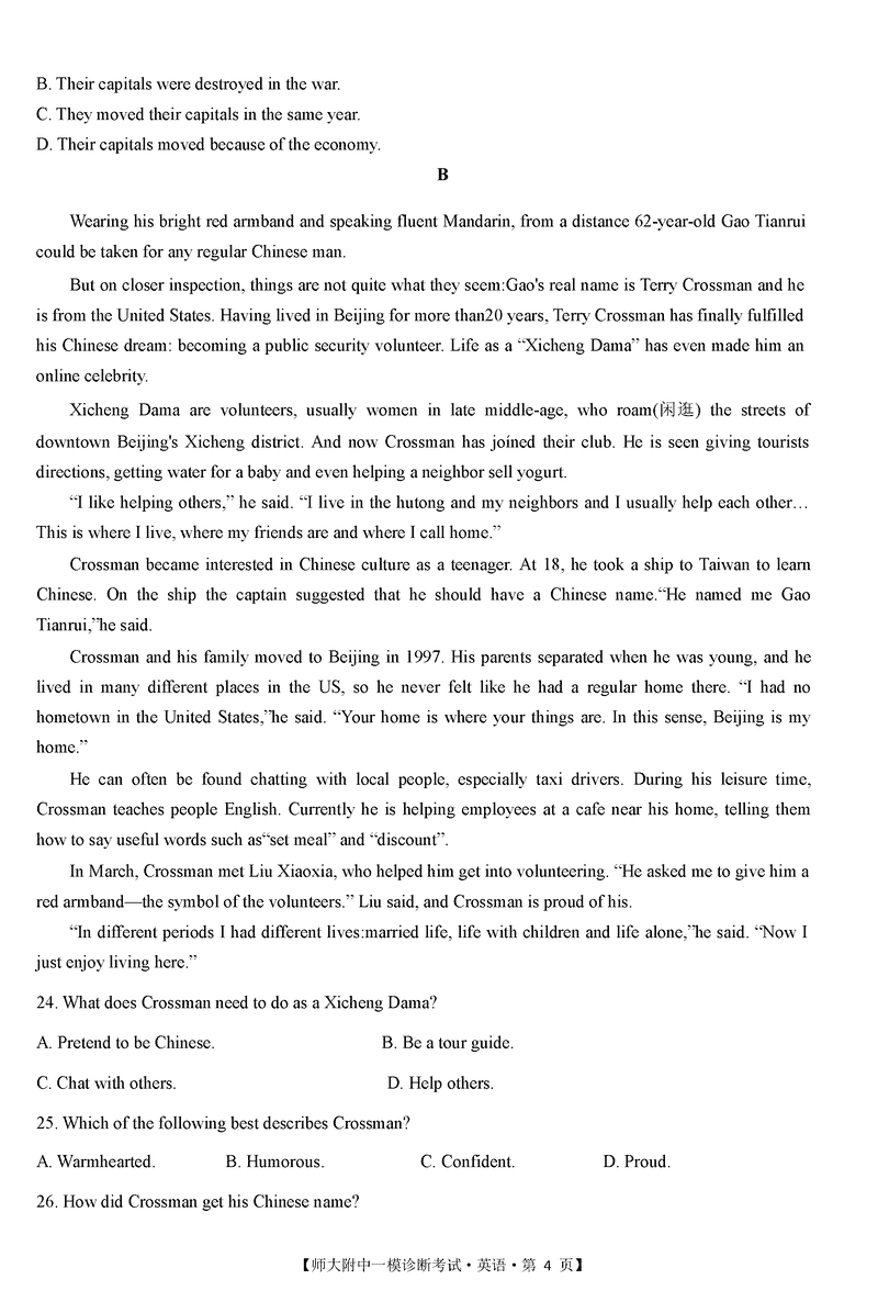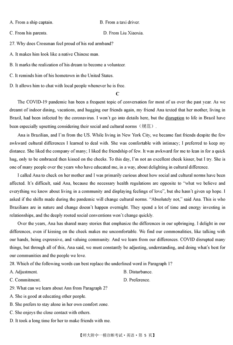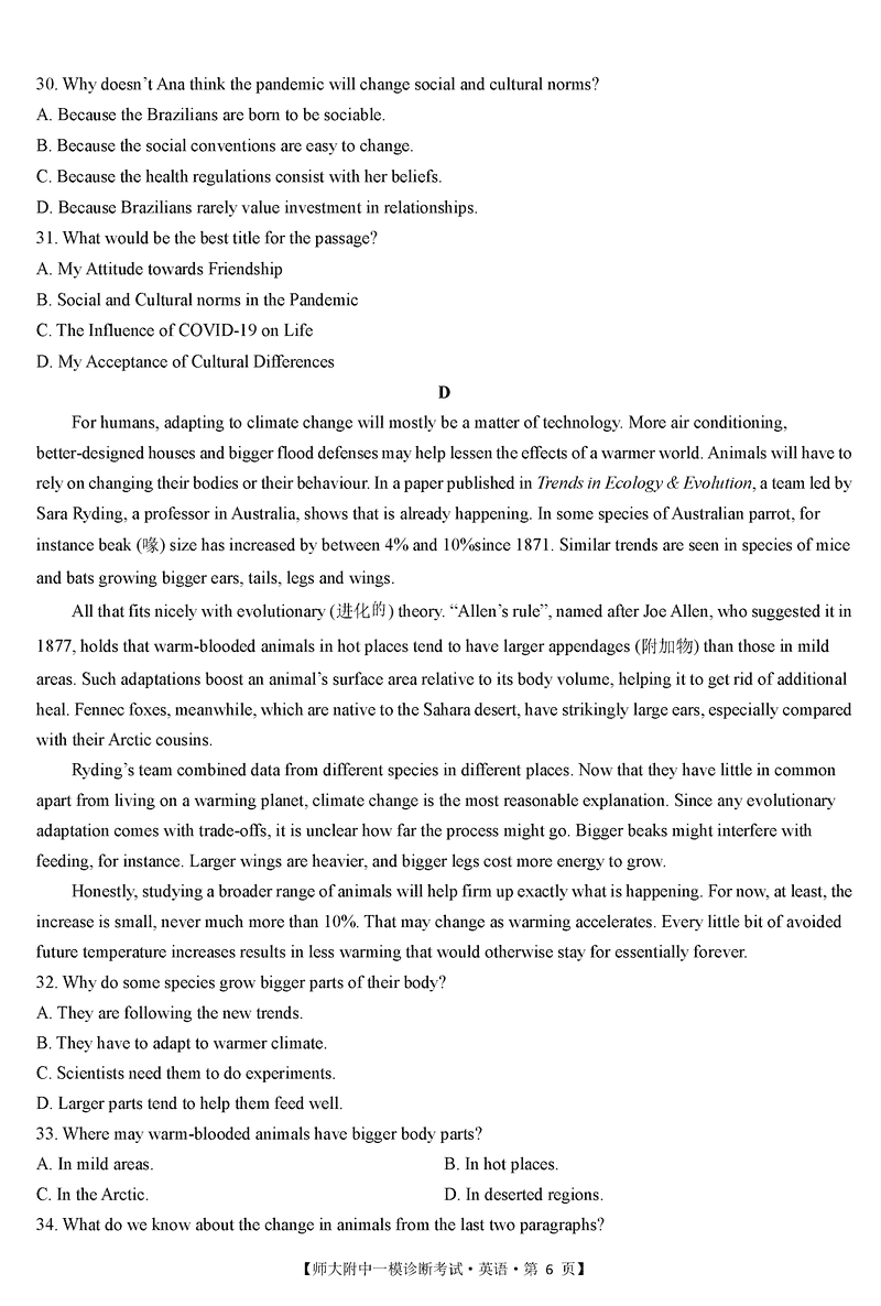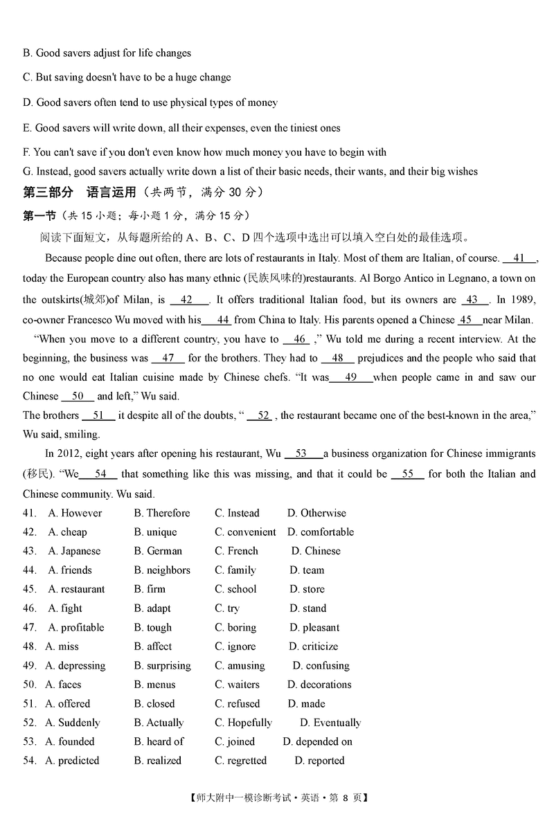甘肃西北师大附中2025届高三上学期一模英语试题及答案
